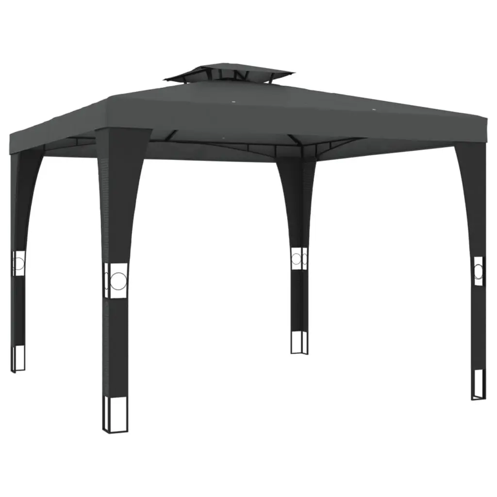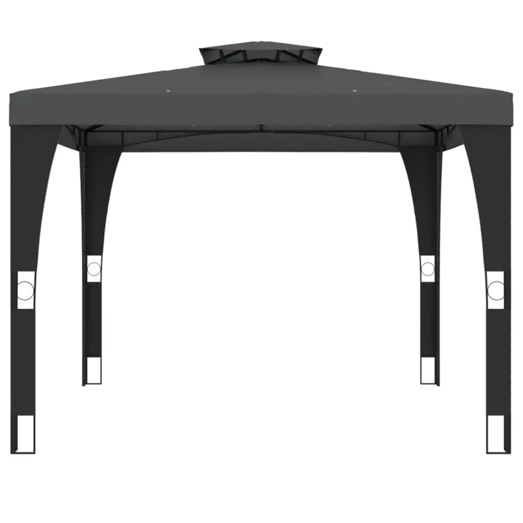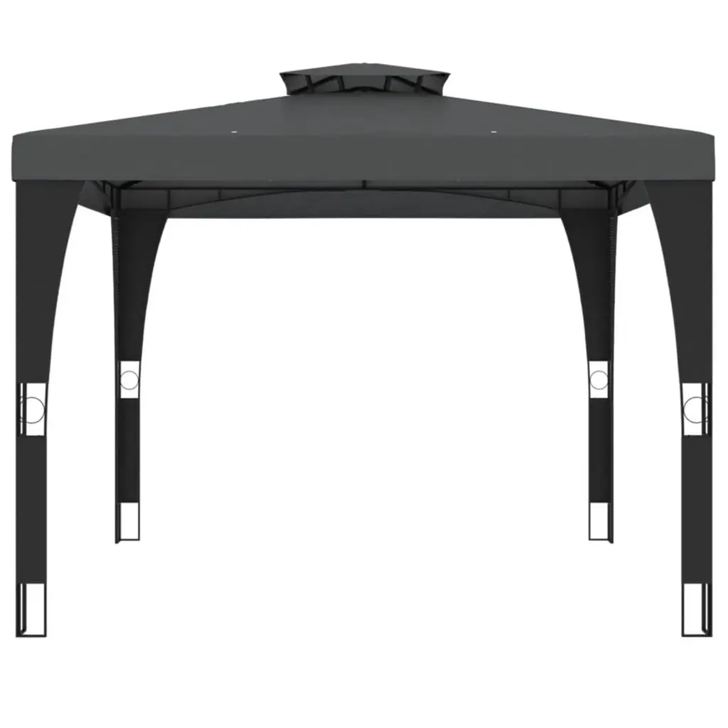 This large anthracite garden gazebo is a fantastic addition to any outdoor space, made for chilling out and hanging with friends. With its sleek, modern style and sophisticated grey color, the gazebo creates a welcoming vibe just right for dining, lounging, or celebrating special moments with friends and family. Weather Resistance: Made from water-resistant polyester, this gazebo remains useful even during light rain, letting you keep enjoying your outdoor fun. Its UV-resistant materials are key for keeping your gatherings safe from harsh sun exposure, ensuring comfort for all.Spacious Design: Supports up to 10 people, this big space is fab for all sorts of gatherings like birthday parties, BBQs, or family hangs. Its generous dimensions of 117.3 in x 117.3 in give you enough room to set up seating and tables comfortably.Double Roof Feature: The stylish double roof design not only looks great but also enhances airflow inside the gazebo. It keeps things cooler on hot days while offering better stability against wind, leading to a more enjoyable space.Robust Construction: The gazebo's frame is built from powder-coated steel, giving it sturdiness and weather resistance. This heavy-duty build guarantees that the gazebo can take on various conditions, offering years of enjoyment.Easy Assembly: Comes with all the necessary mounting bits and clear instructions, making it easy to set up even for two people. Quickly transform your outdoor spot for immediate fun.