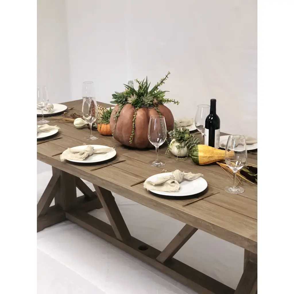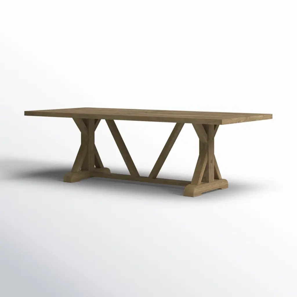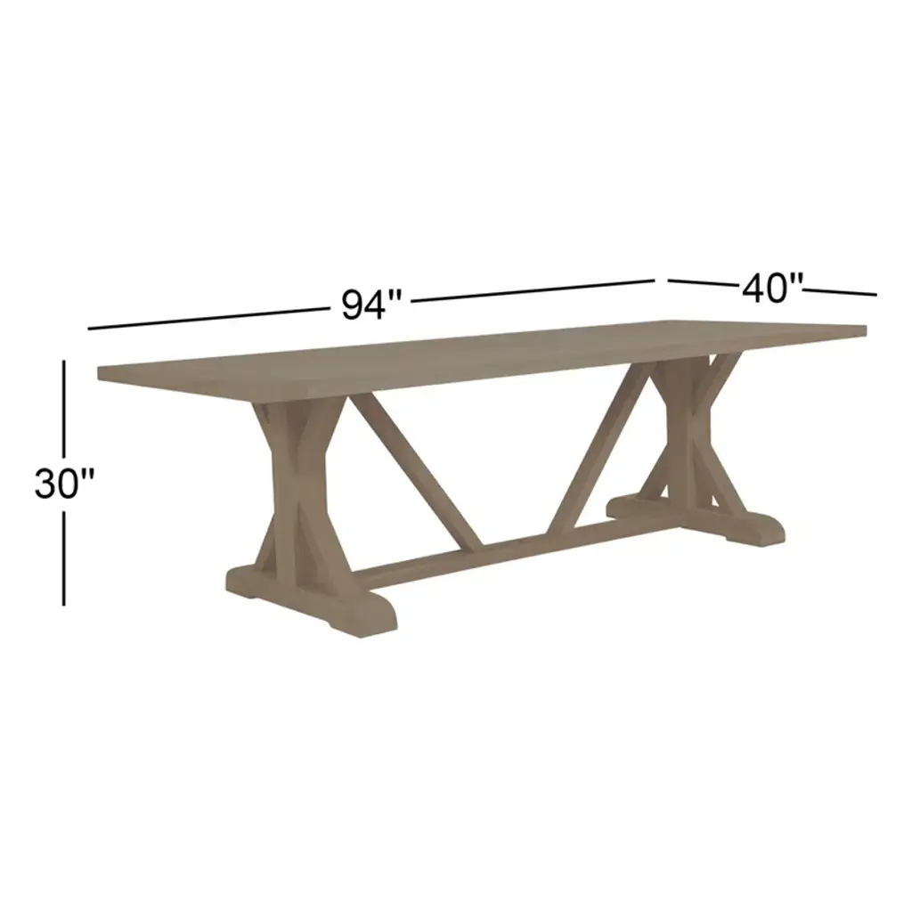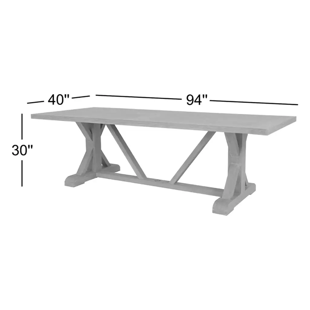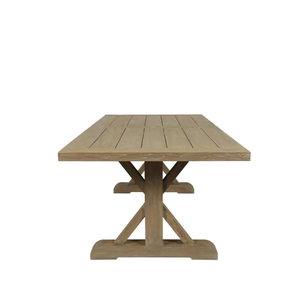 "Vienna's coastal teak dining table is a beautifully contemporary take on a classic. A slat tabletop sits on a beautiful trestle base. Our unique multi-step finish gives the natural wood a warm gray color, complementing our other collections for the perfectly curated coastal design. Constructed of 100% solid teak wood, these excellently engineered pieces develop a lovely patina over time. Their natural grooves and subtle rustic features lend a unique look and character to each item - no two pieces are exactly alike. Teak wood, known for its durability and natural moisture-resistant oils, is an excellent choice for outdoor furniture that will stand the test of time. - 94 x 40" rectangular dining table - Solid teak wood frame - Hand applied coastal teak finish - Umbrella hole with cap included - Some assembly is required Coastal teak, with its versatile finish, coordinates well with many Vienna collections"