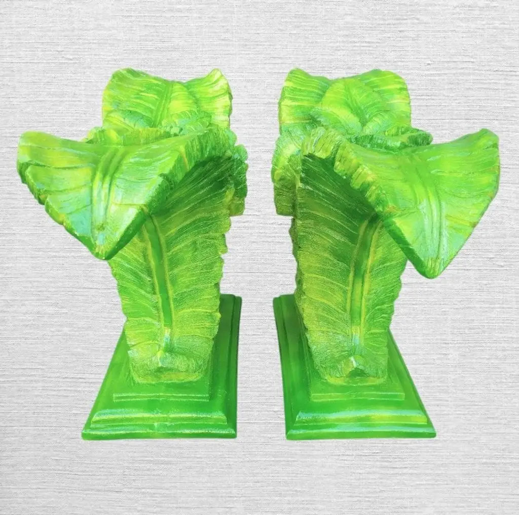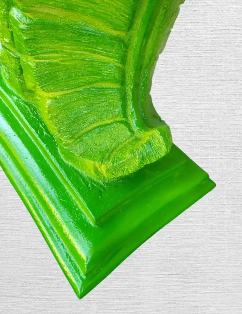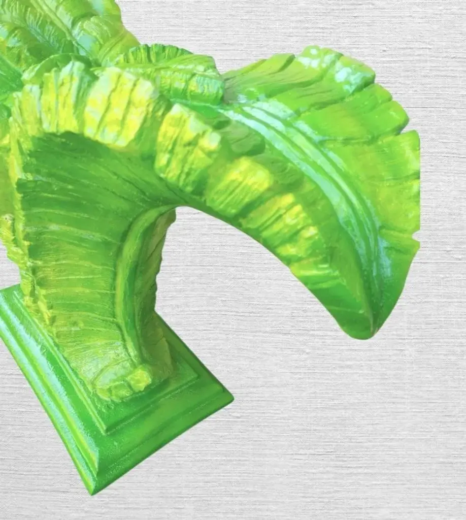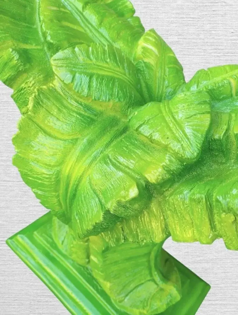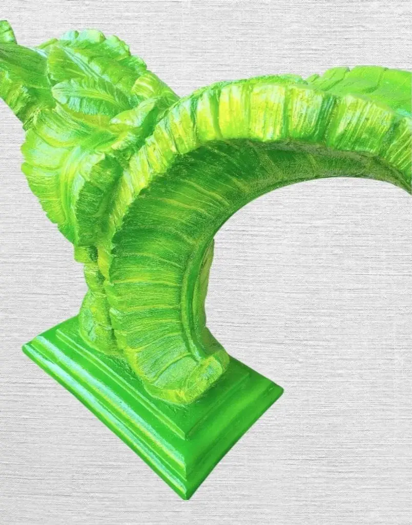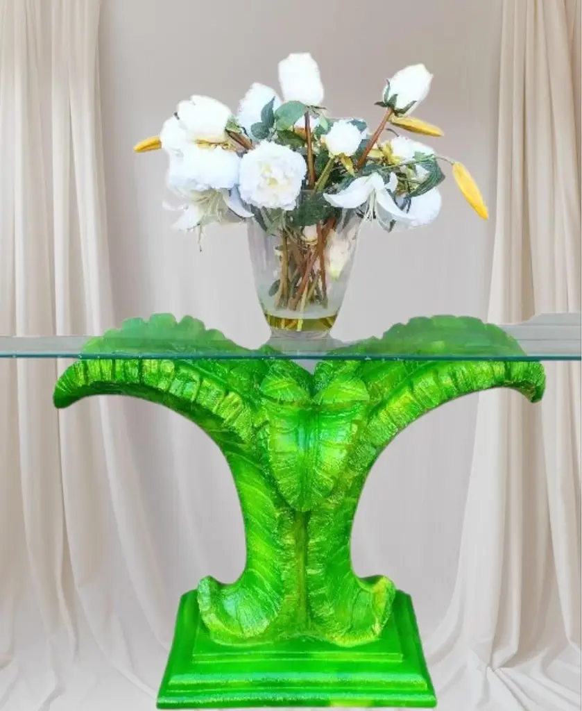 A beautiful vintage plaster Serge Roche huge palm frond hand painted table base. I have 2 available sold separately. The base can be used by itself as a fabulous console table with glass on top. As a pair they can hold a massive piece of glass as a dining room table. I hand painted them with 3 shades of green and a touch of yellow which really brings out the details and make them pop. They're very heavy bases but not immobile and perfect for a tropical palm Beach style design. If doing a local pickup I have a huge rectangular glass which can be purchased if desired. The listing does not come with any glass.
