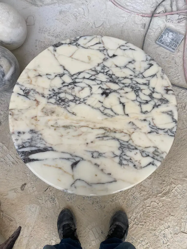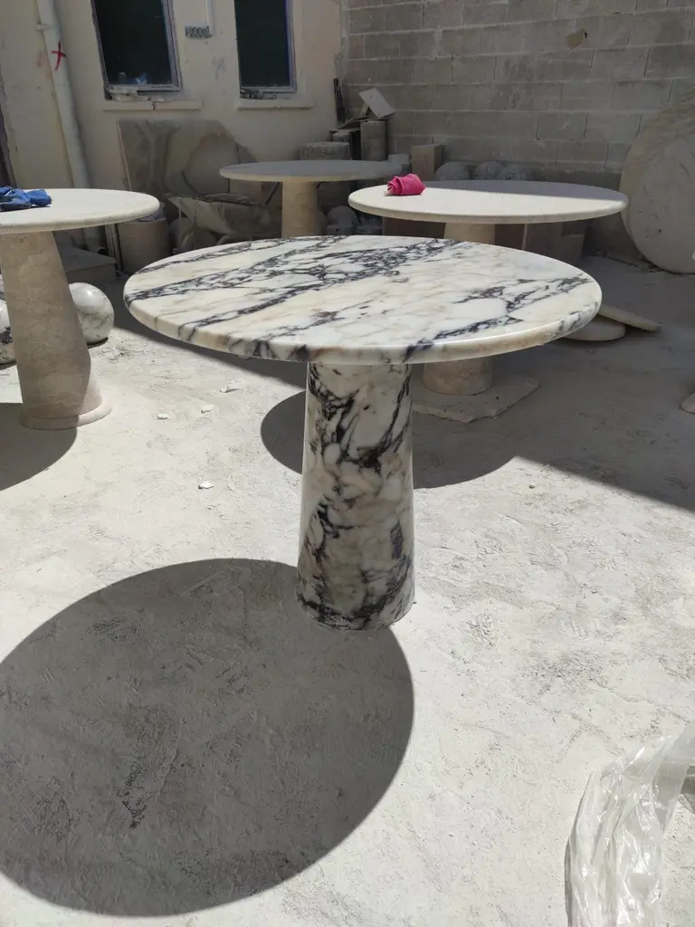 This minimalist table, crafted from viola-veined marble, features a perfectly balanced circular top resting on a sculptural column leg—an homage to Angelo Mangiarotti’s vintage designs.We sourced premium marble blocks to ensure exceptional quality; a range of viola marble options is shown in the listing. Dimensions: H 75 cm x Ø 75 cm (also shown in Ø 95 cm). Other sizes available on request.For easy transport and installation, the top and base ship separately.Designed by MY HABITAT, an interior design studio, this collection was born from the need for timeless, custom-made tables that balance sculptural beauty with practical sizing and finishes. Founder Alexandra created these pieces to meet the demands of her projects. Made in collaboration with expert stone artisans, each table is built to last and be loved for years.