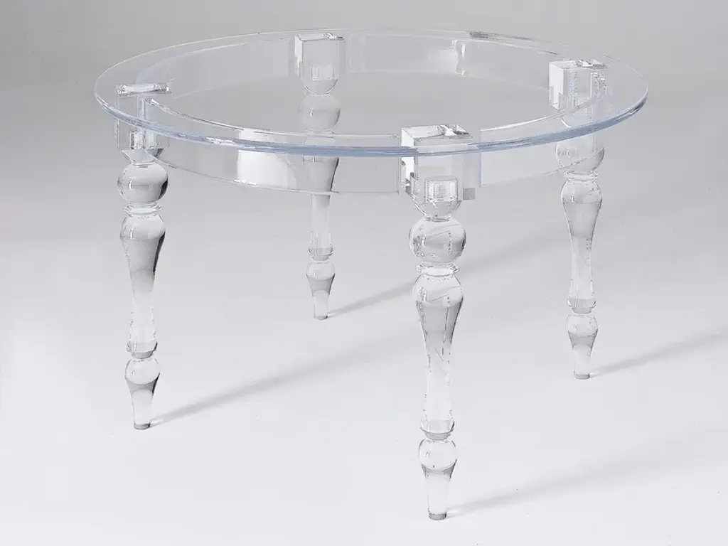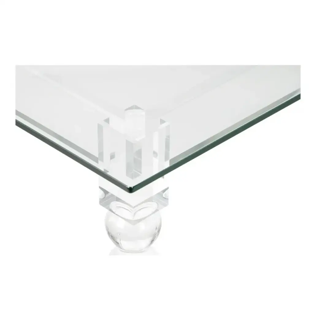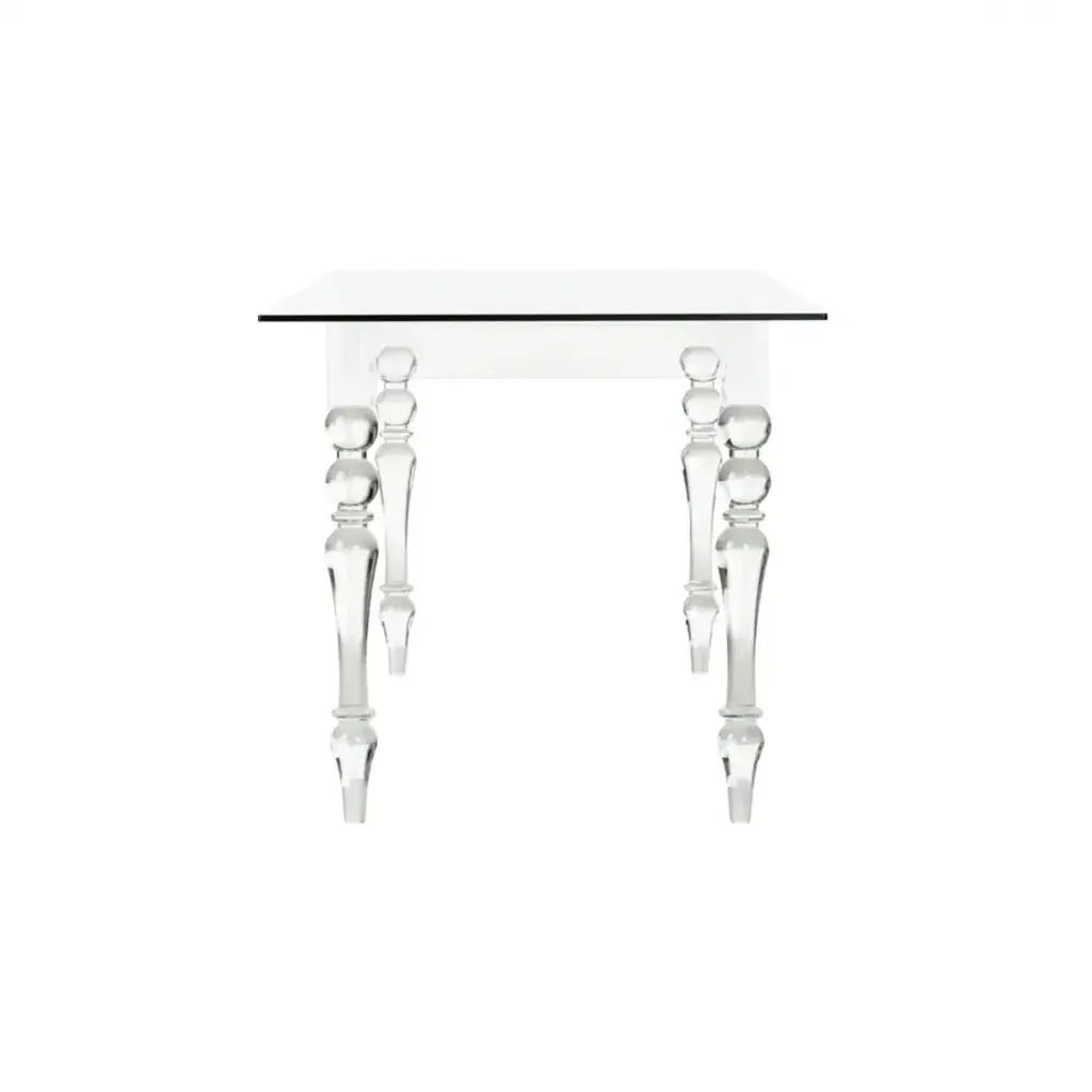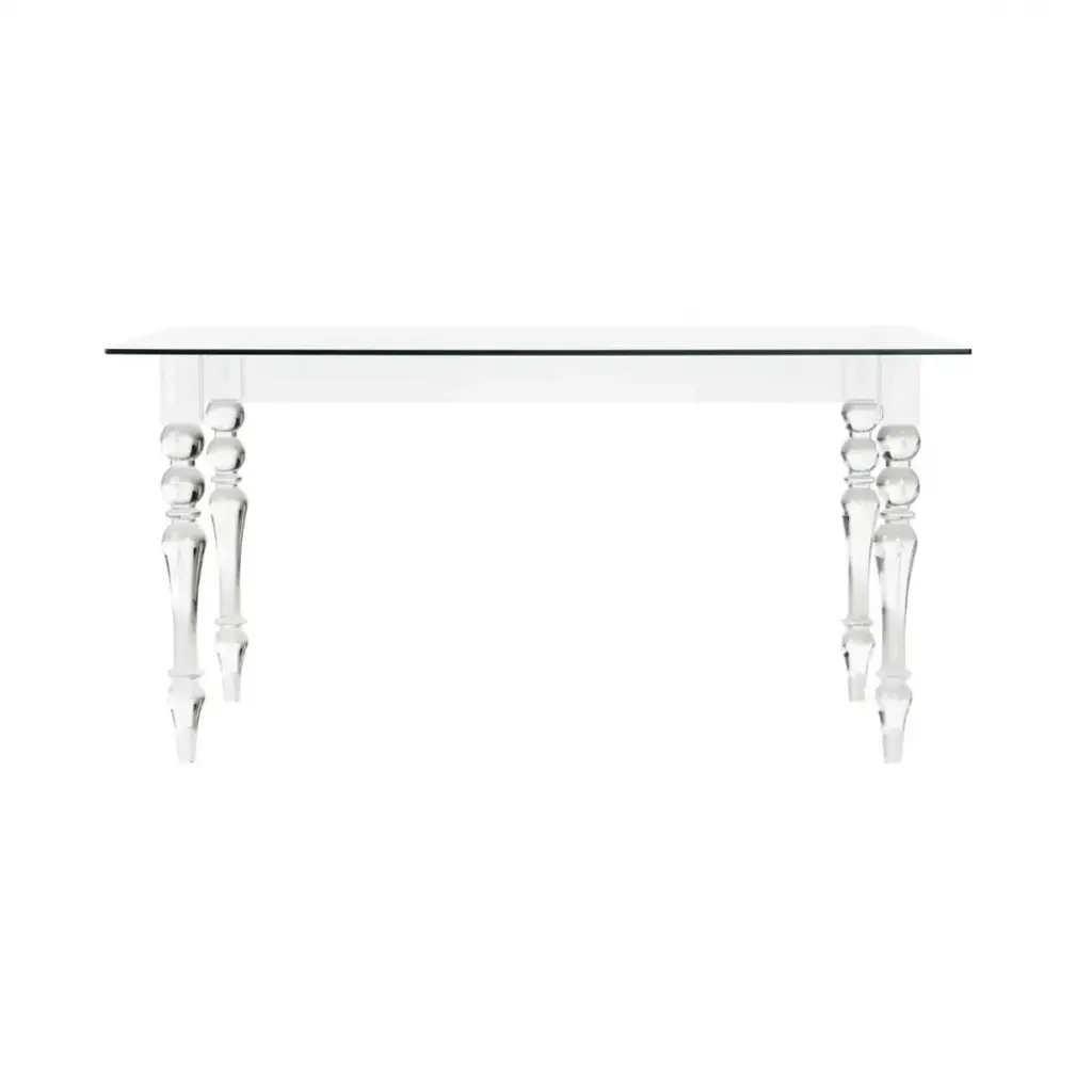 Clean clear lines of acrylic, rounded fluted legs and a glass top highlight the neoclassical aesthetic of this piece which can be used as a desk or small dining table. Sophisticated details create a statement piece for any room.