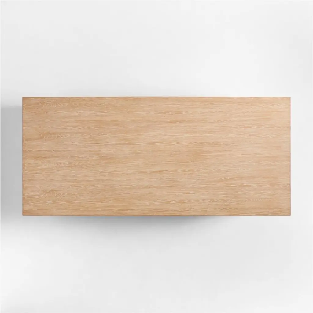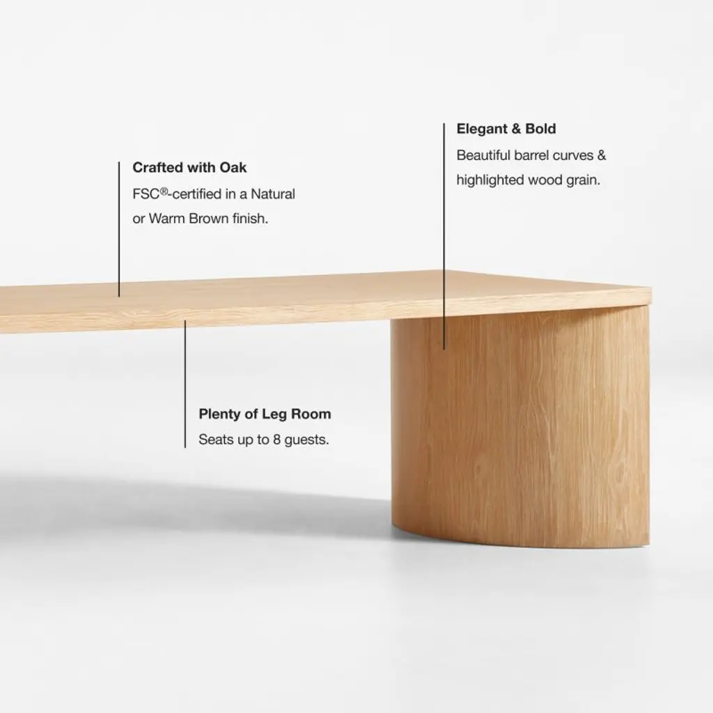 Virage leans into the simple drama of clean lines and half-circle curves. An easy way to give your dining room an artful point of view, the table shows off the beauty of solid oak and oak veneer with a natural oak finish and light cerusing to bring out the grain. Opposing barrel-curved supports create the bold silhouette while providing leg room for end-of-table seating. Pair this modern and elegant table with coordinating Virage dining room chairs to seat six to eight diners.