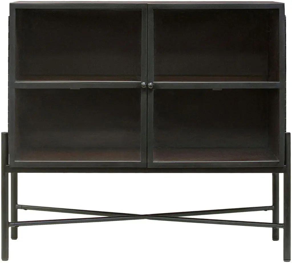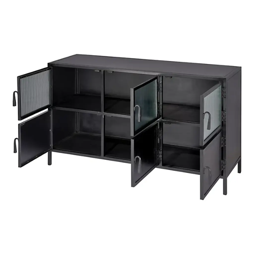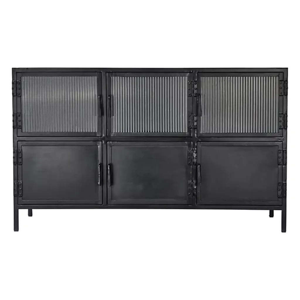 The Vitrino 6 Door Console Table from Jamie Young Co. expands storage possibilities through its generous proportions and easy-to-use features. Its wide, rectangular design features three reeded glass compartments atop three solid metal compartments, each fitted with custom iron handles for easy opening and closing. The hand-forged frame itself showcases metalworking expertise through its precise joints and consistent finish. This console can serve multiple functions - as a media unit, dining room storage, or display case.