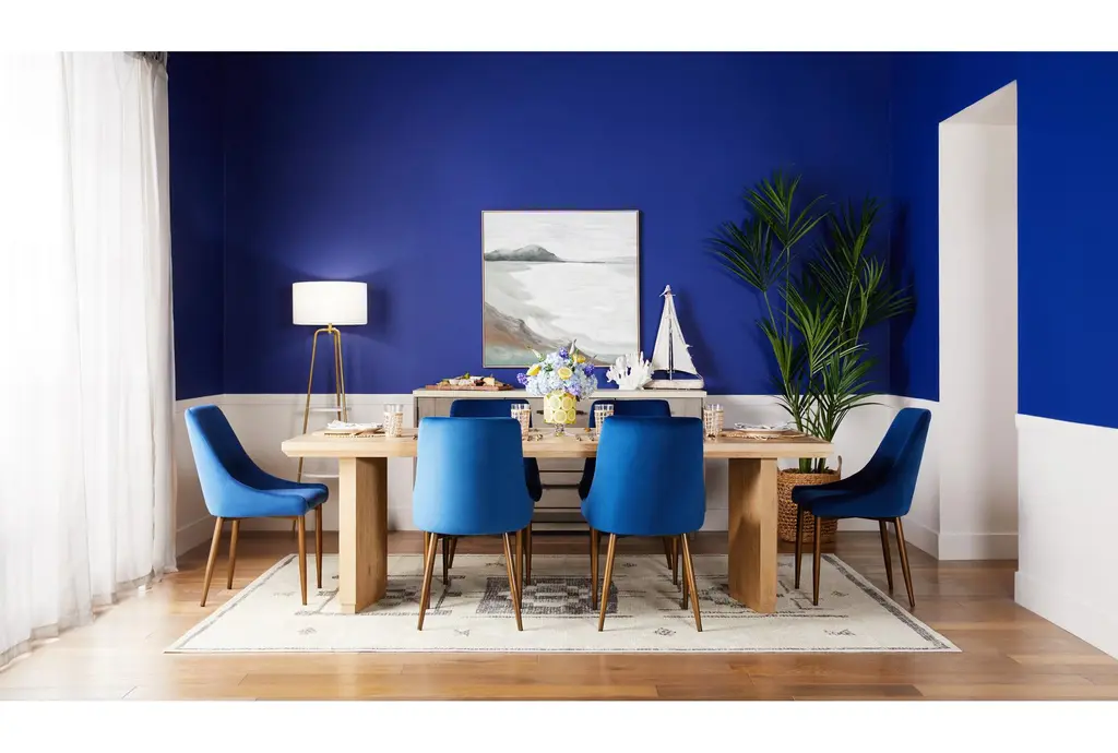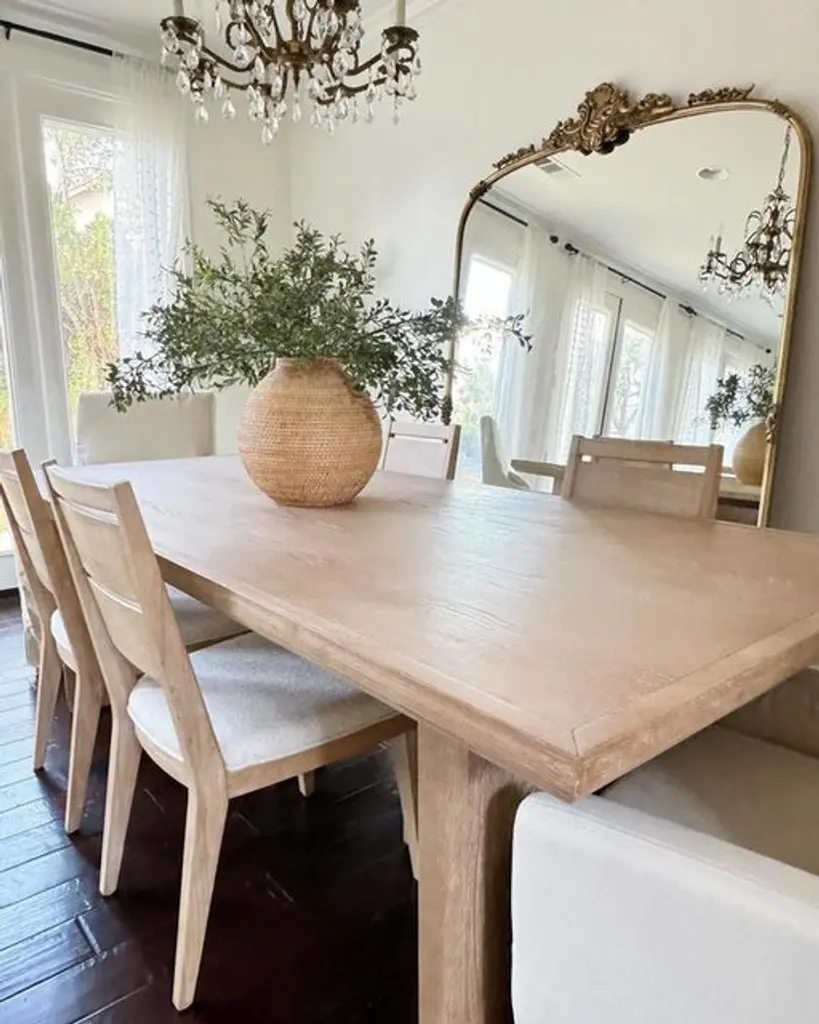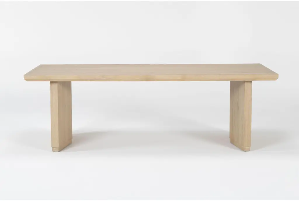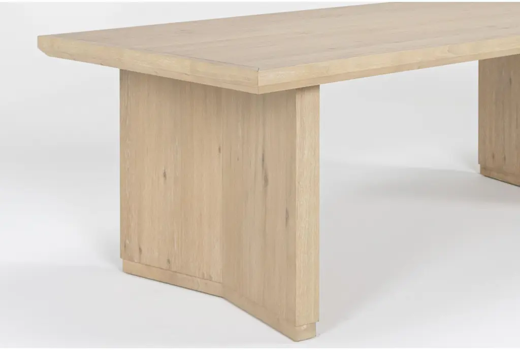 Elevate your dining experience with the Voyage Natural Beige Wood 94" Rectangular Trestle Dining Table by Nate Berkus + Jeremiah Brent. This modern dining table features a stunning sun drenched oak finish, offering a natural and inviting look to your dining room. Crafted from knotty white oak veneer and solid hardwood, this table combines durability with a touch of sophistication.