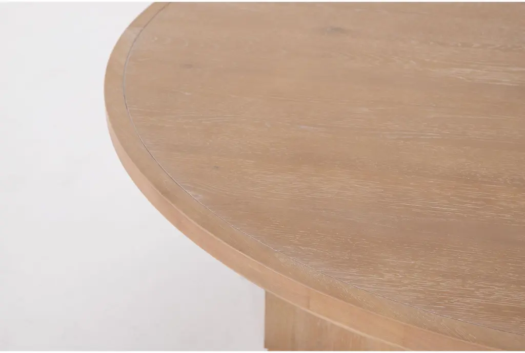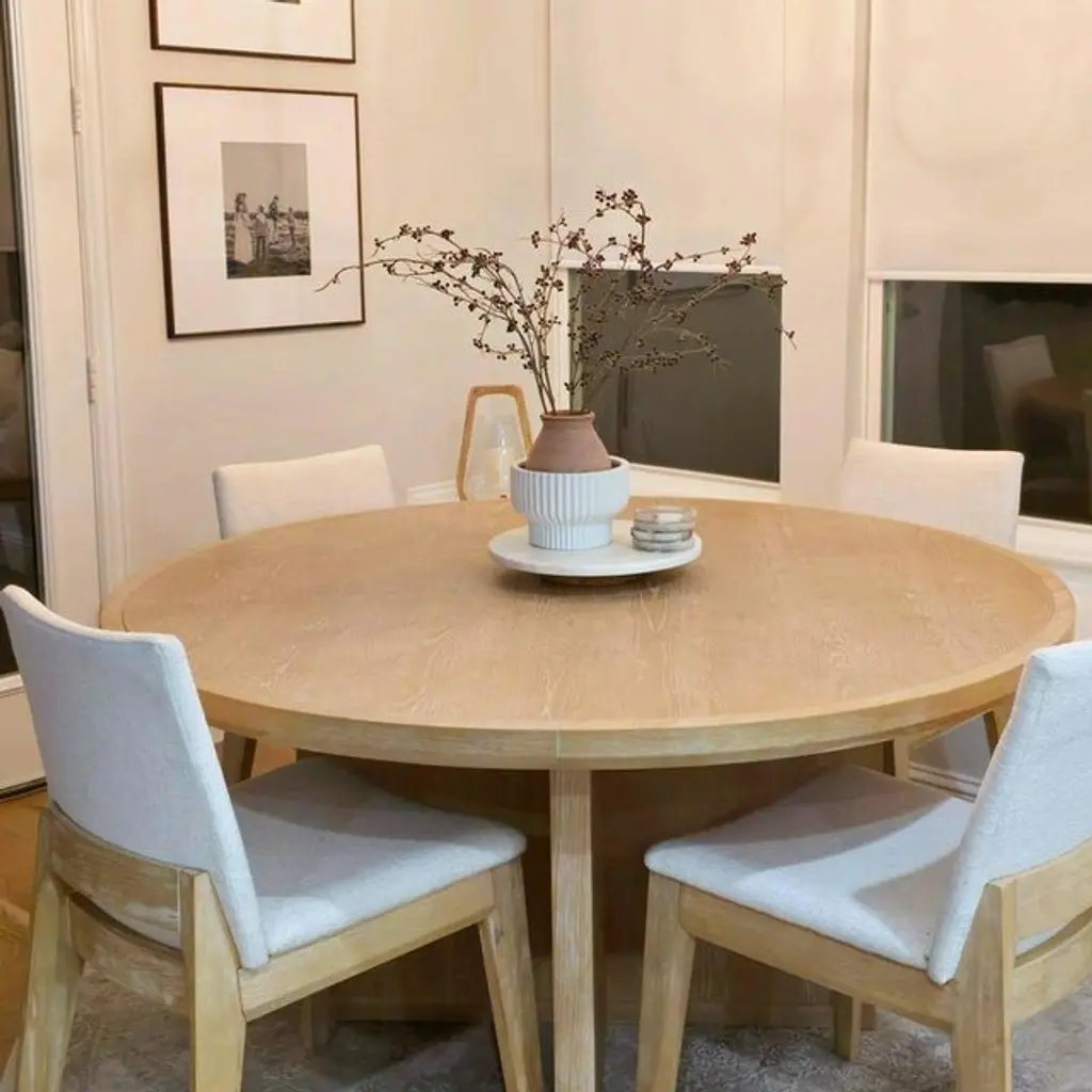 The Voyage Natural Wood 60" Round Dining Table by Nate Berkus + Jeremiah Brent is a stunning addition to any dining room or kitchen. Its modern design and natural color bring a touch of warmth and simplicity to your space. Made from knotty white oak veneer and solid hardwood, this table is both durable and stylish.