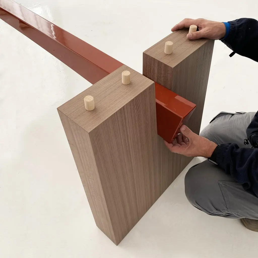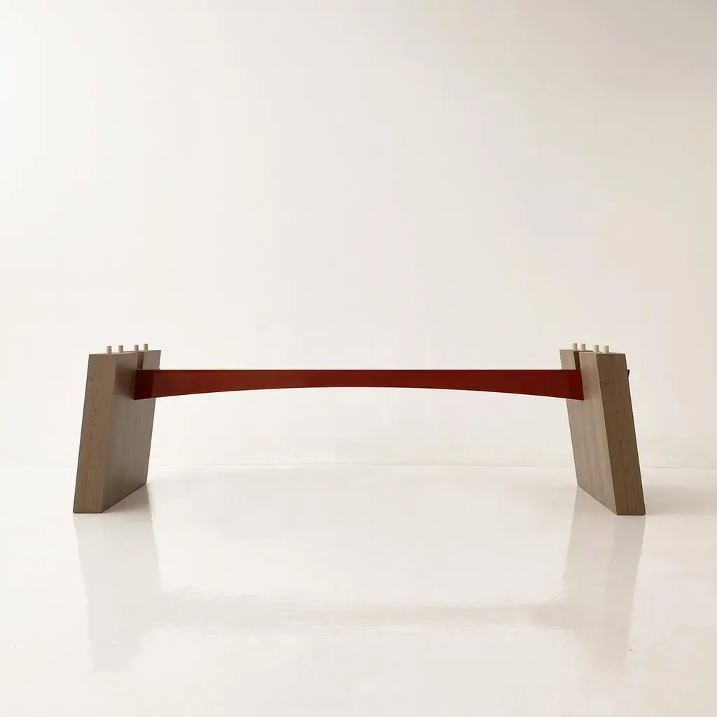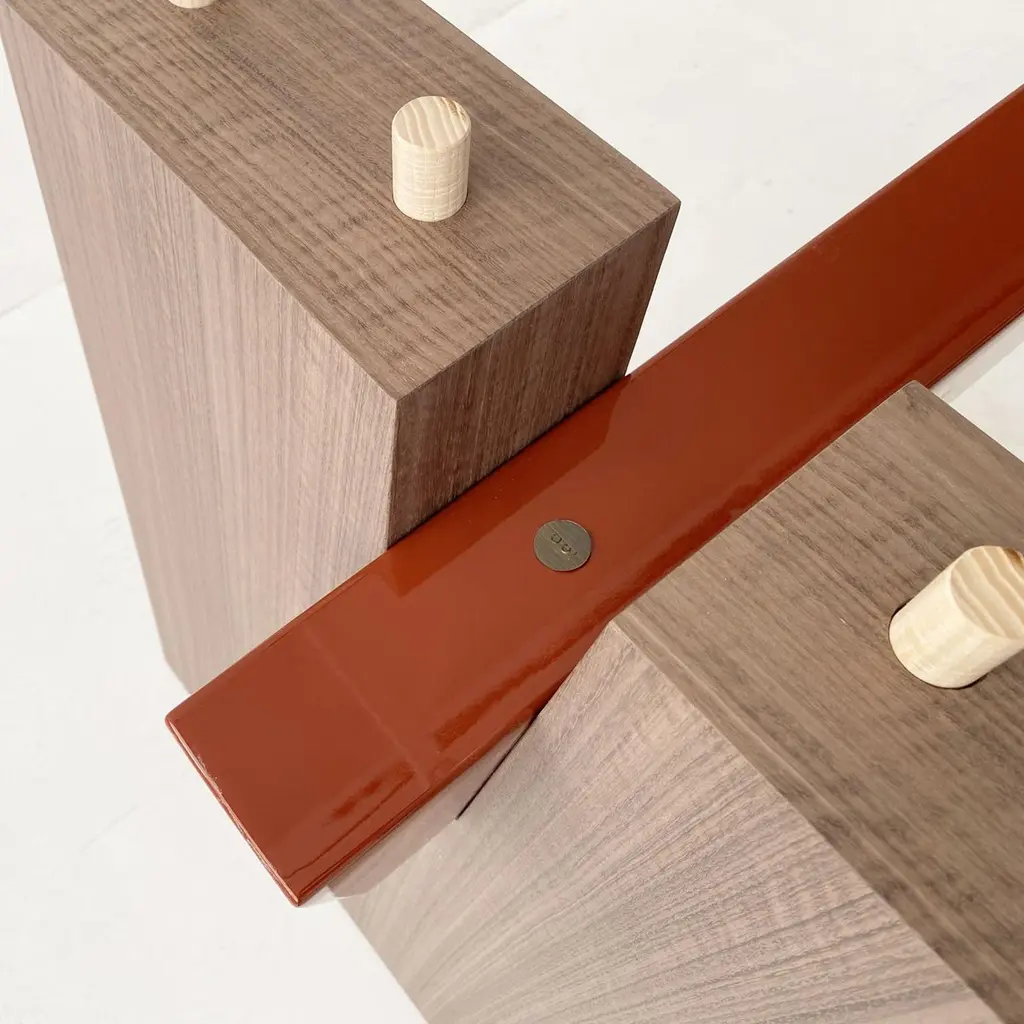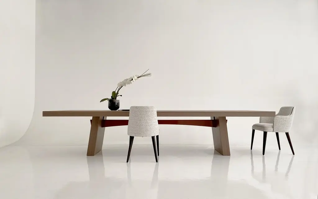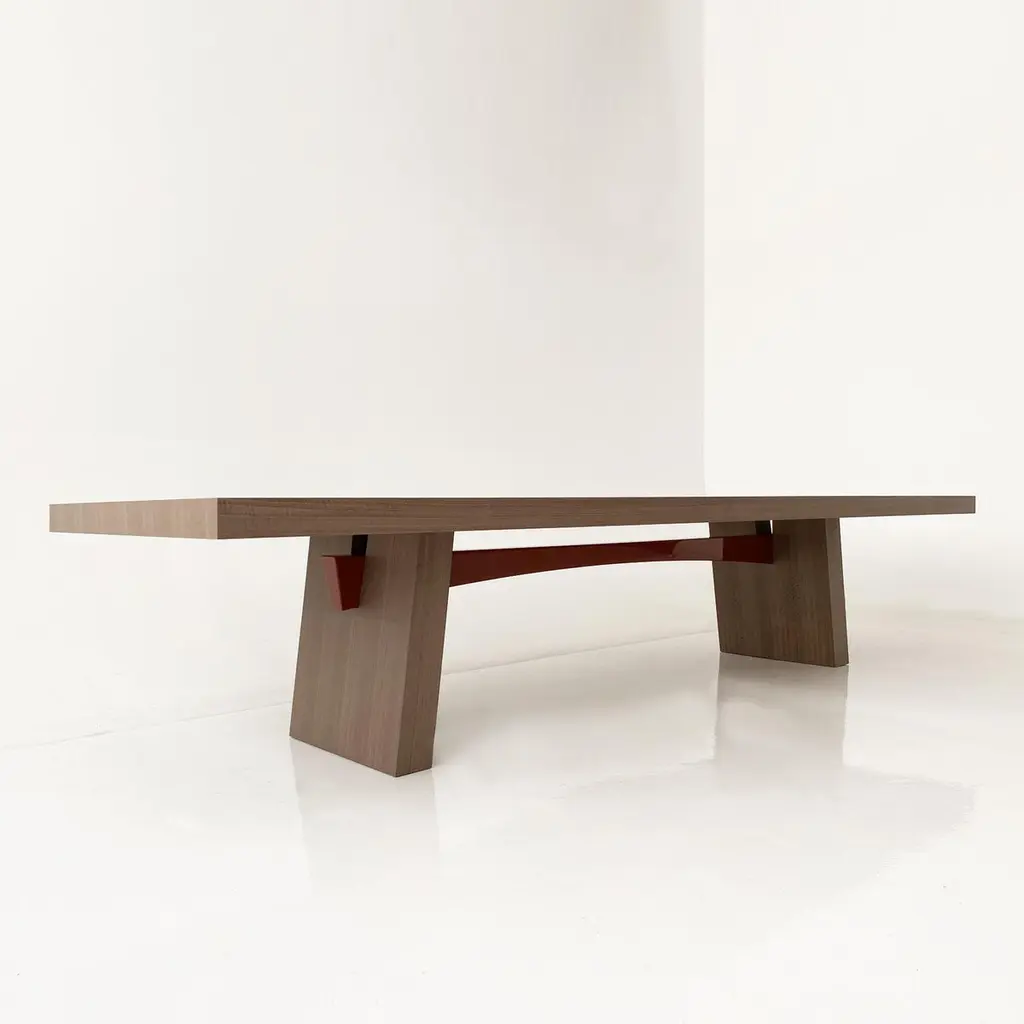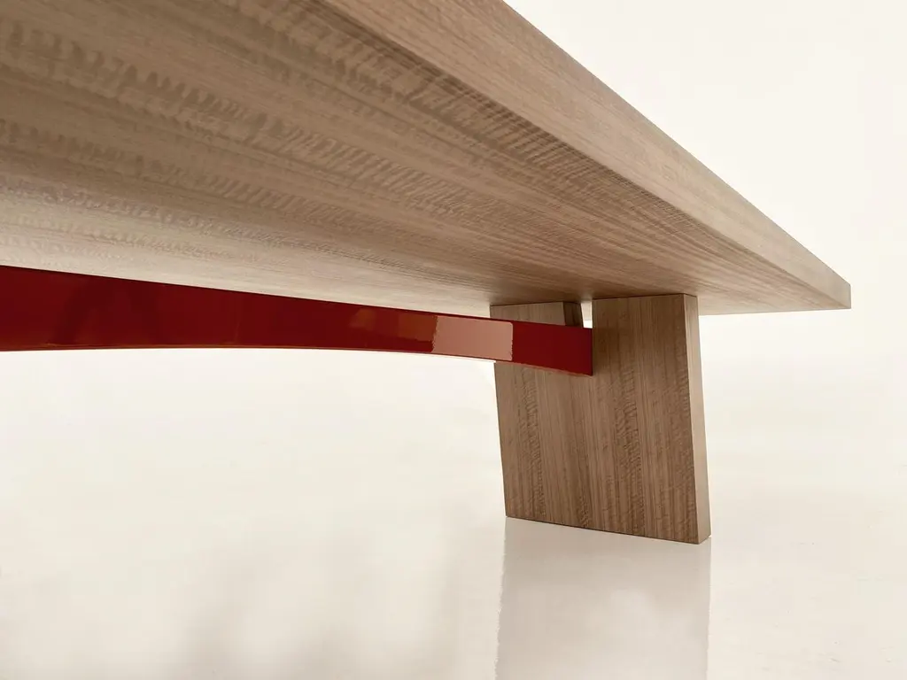 A dining table of generous proportions with a distinctly thick top and angled legs, its sleek design enhanced and enriched by the curve of its contrasting lacquered beam.Designed in Elm wood with a dark-red gloss-lacquered beam, the WA table is also available in matt grey Oak and matt light Oak.The real revolution of the WA lies in the fact that it is made up of only four elements (a top, two legs and a bar), which can be assembled together in five minutes. With the exception of two metal studs with the brand monogram, used to fix the undertop bar, the assembly of the WA does not require the use of hardware. The pieces fit into each other thanks to dowels, and the structure is very solid .In the linearity of the shapes and in the choice of natural materials, the WA is inspired by the Japanese tradition. To which the name also refers, which evokes the concept of harmony and peace.The contrast between the natural wood top and the horizontal support bar is particular, which is available in all the variants of glossy lacquer in the Casa Casati catalogue (also in other colors upon Customer request).