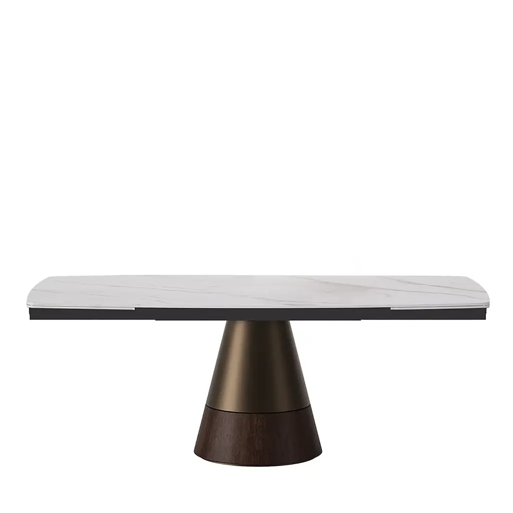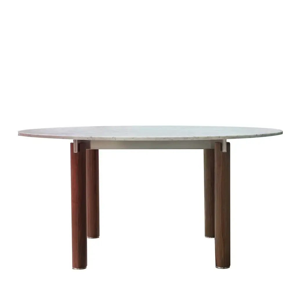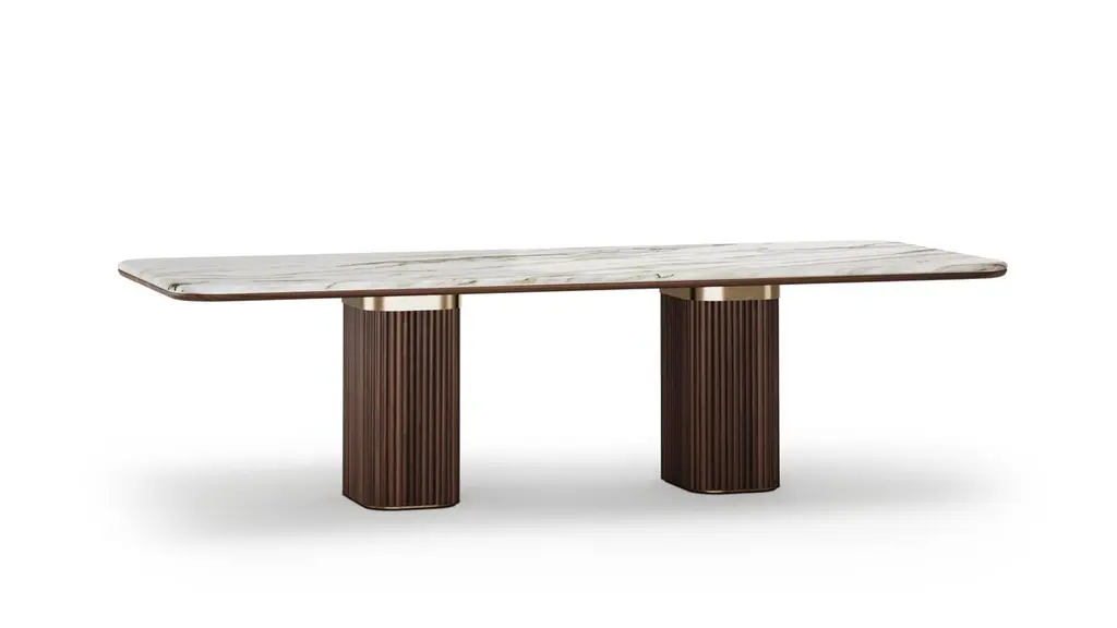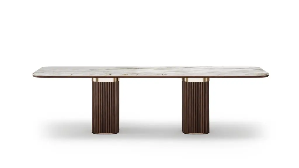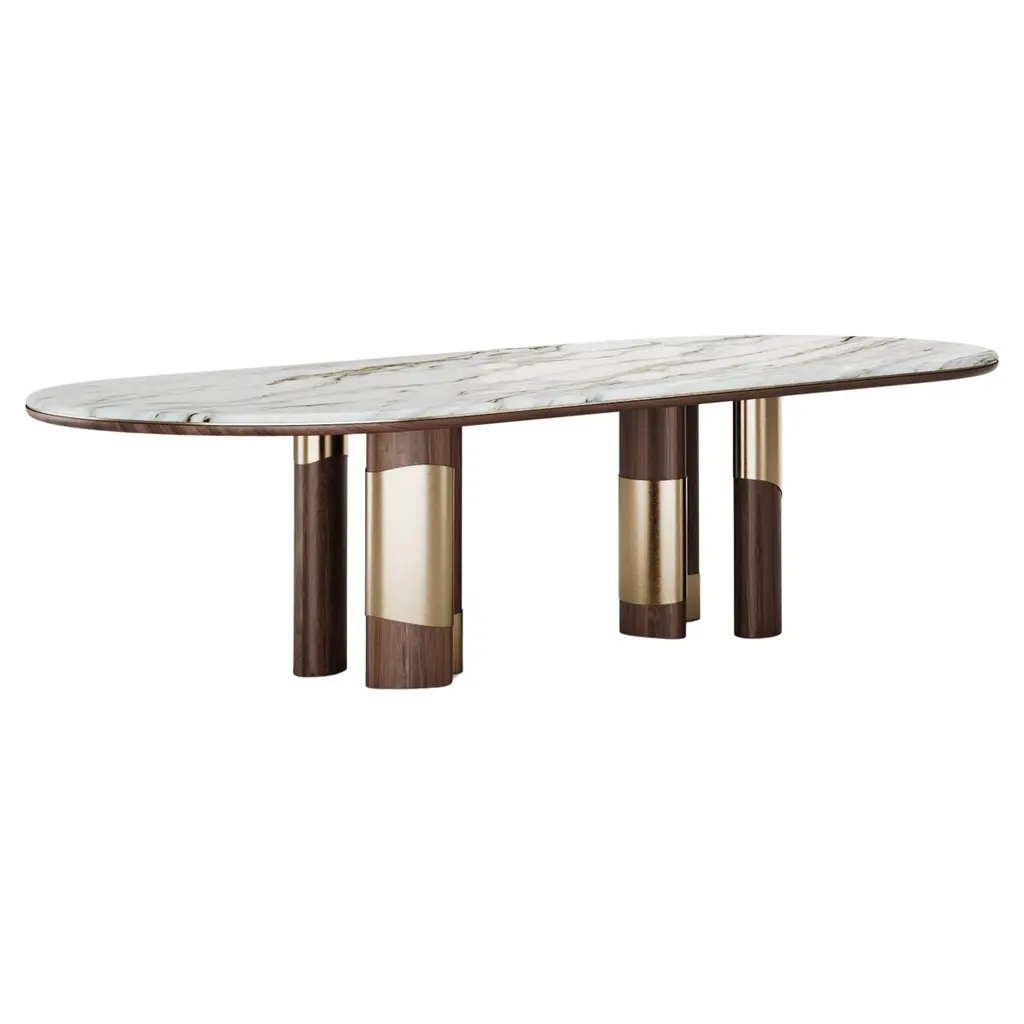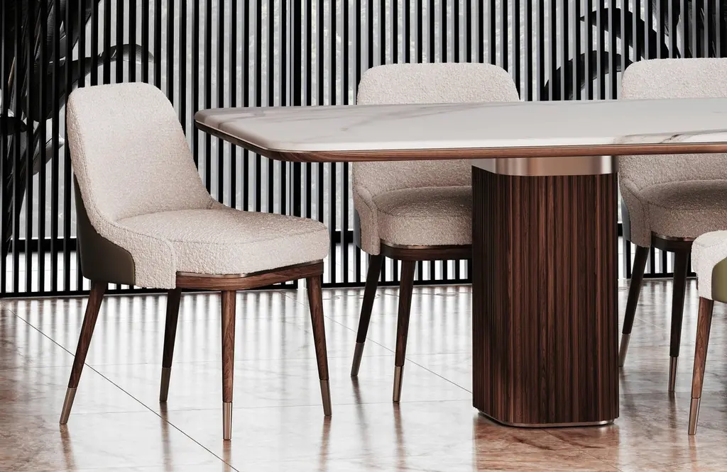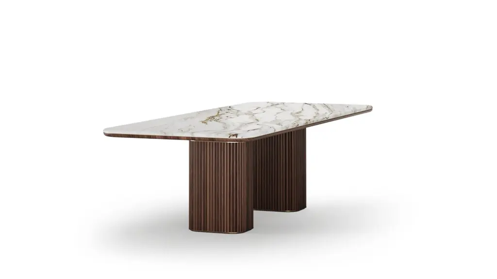 Doran dining table is a compact yet luxurious statement piece, combining rich walnut wood with refined materials.The tabletop is finished in exquisite Calacatta Gold marble, introducing veined elegance and natural beauty. Perfect for intimate dining or upscale breakfast nooks, Doran is ideal for interiors that value both craftsmanship and quiet luxury. Its balanced proportions and tactile materials create a harmonious dialogue between strength and softness.