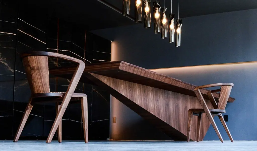 Diamond dining table by Vasco VieiraDimensions: W 300 x D 100 x H 75 cmMaterials: American walnut 100% solid woodVariations available. Please contact us.Around the TreeThe Diamond table is a large suspension table created by the Portuguese architect Vasco Vieira and deserves to be among the best design pieces in the world. Its length can go from 5 to 6 meters, having only 40 cm of contact with the ground. It is one of those cases where creativity and know-how combine to create something extraordinary.It is certainly another work of art where all areas of a company must be unified to make it happen. From the design, the mechanics, to the mastery of the craftsmen, including those who transport and assemble it, all must be professionals. The diamond table requires dedication and passion for what is done, nothing less.Our values lie in the respect, protection and sense of continuity towards our natural resources, our roots must be preserved, maintained and cared so they can keep inspiring us as well as our future generations.We are committed to be a sustainable brand; we feel obligatedto respect the purity of the materials we use in our pieces giving them the importance they deserve and making products that can be cared through generations with maintenance and repair. Portugal has centuries of history in woodworking, we draw honoring that tradition and combining it with state-of-the-arttechnologies, always trying to produce furniture with a high-level practical value and connecting our ancestry’s generations with the ones to come.Every masterpiece we make represents a tribute to the materials we use. This vow of respect represents the value of our collection and makes it possible for us to ensure the quality of our pieces, giving us the confidence to mark them as “Made in Portugal” with the distinctiveness it deserves.