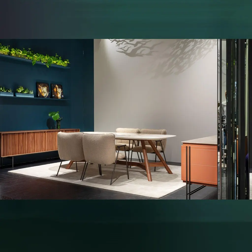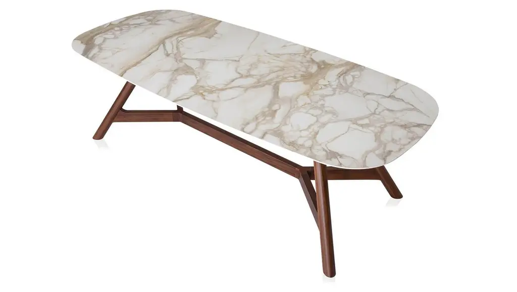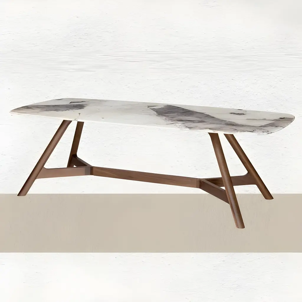 This dining table has a soap shaped top and a base in total solid walnut. The marble dining table has a unique way of joints in the base, rendering it a true design piece. Materials and finishes:Solid Walnut, Carrara White Marble.Dimensions:Width: 94.49 in. (240 cm)Depth: 43.31 in. (110 cm)Height: 29.53 in. (75 cm)We will be glad to check with the factory’s technical team if sizes, finishes, and colors can be customized.