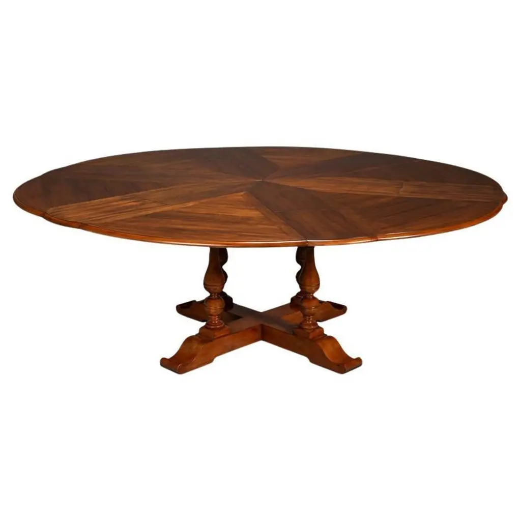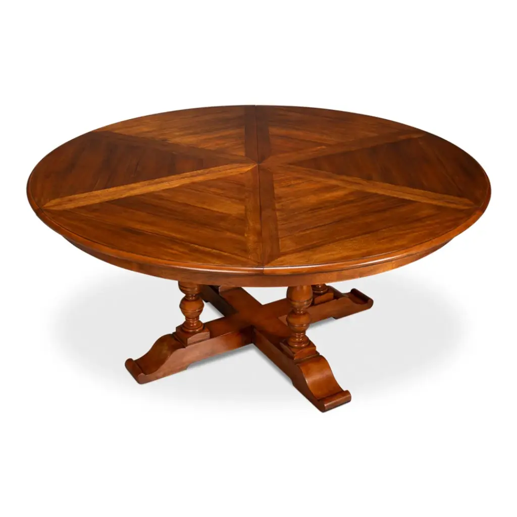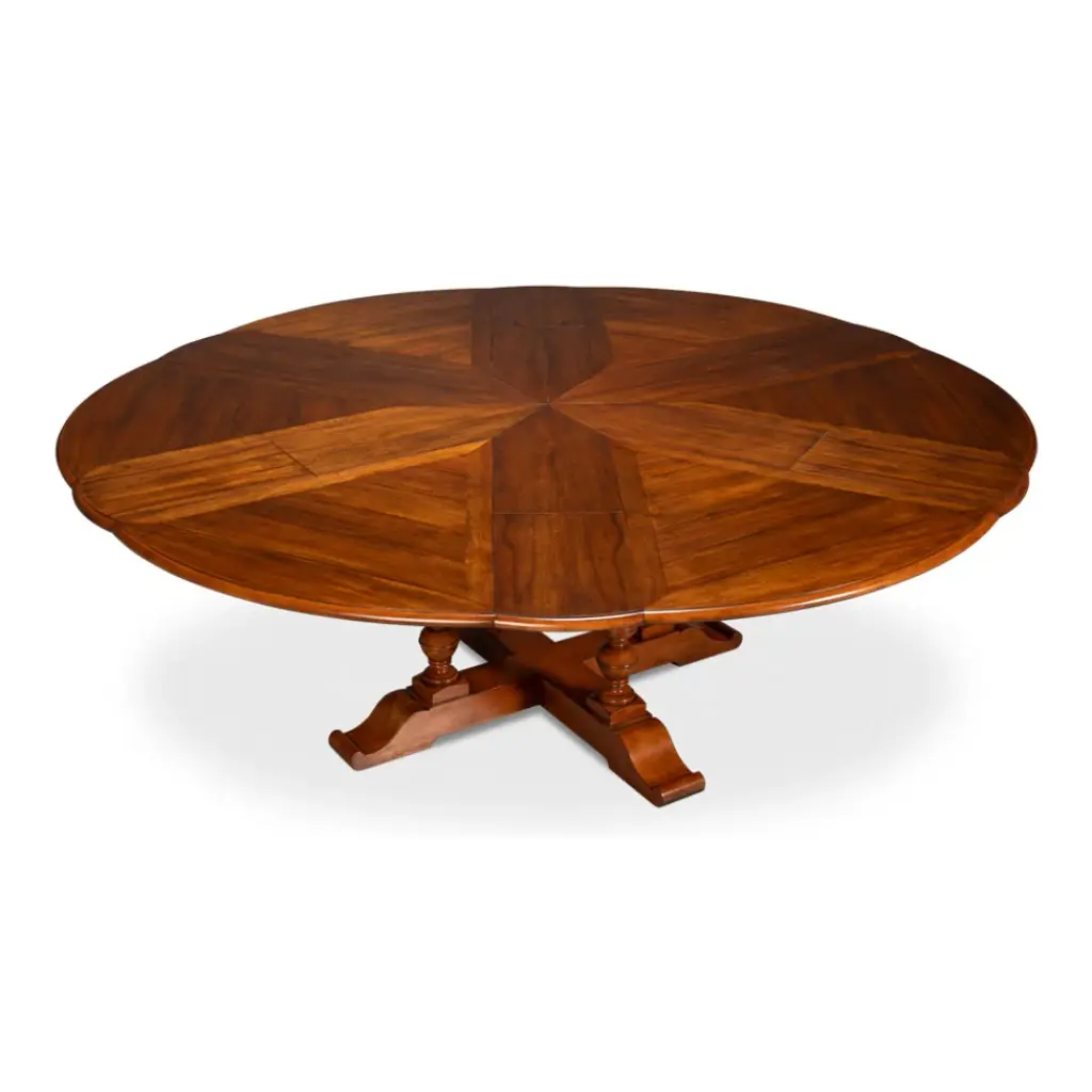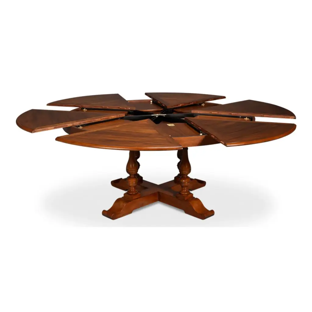 Our new and improved Jupe table is made with updated materials that add strength + durability, yet offer ease of expansion. As your guest list grows, so can your table. Masterful engineering allows this round Jupe dining table to adjust the size while concealing the leaves within. Transitional styling coupled with a rich burnt brown oak finish provides everlasting versatility. Everything about this table is head-turning, even its undulated shape when in an open position. Simply stunning!
