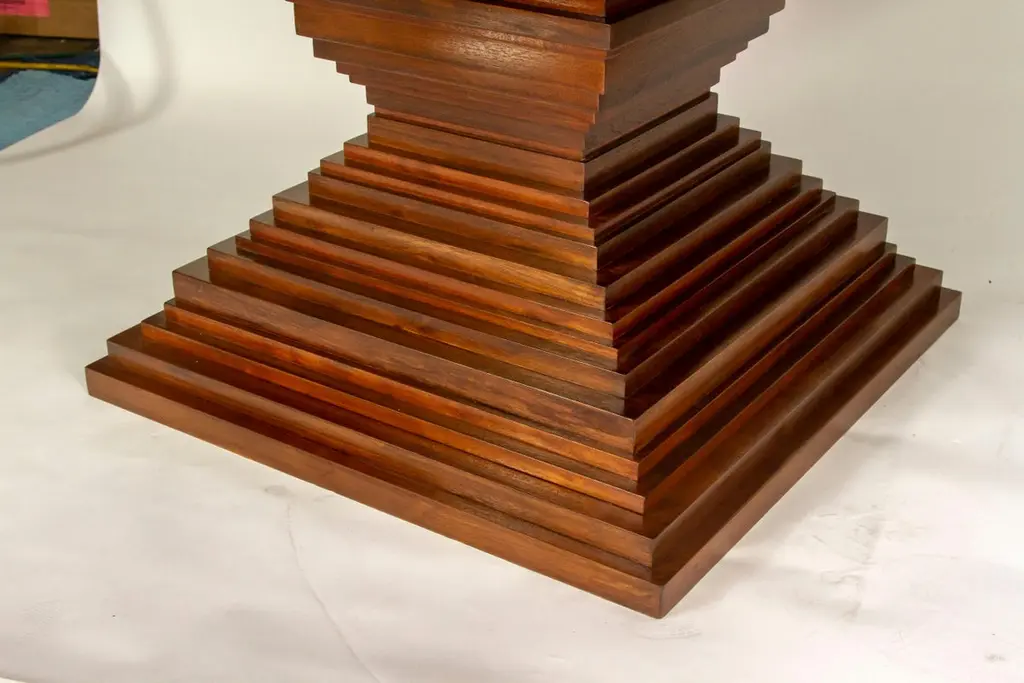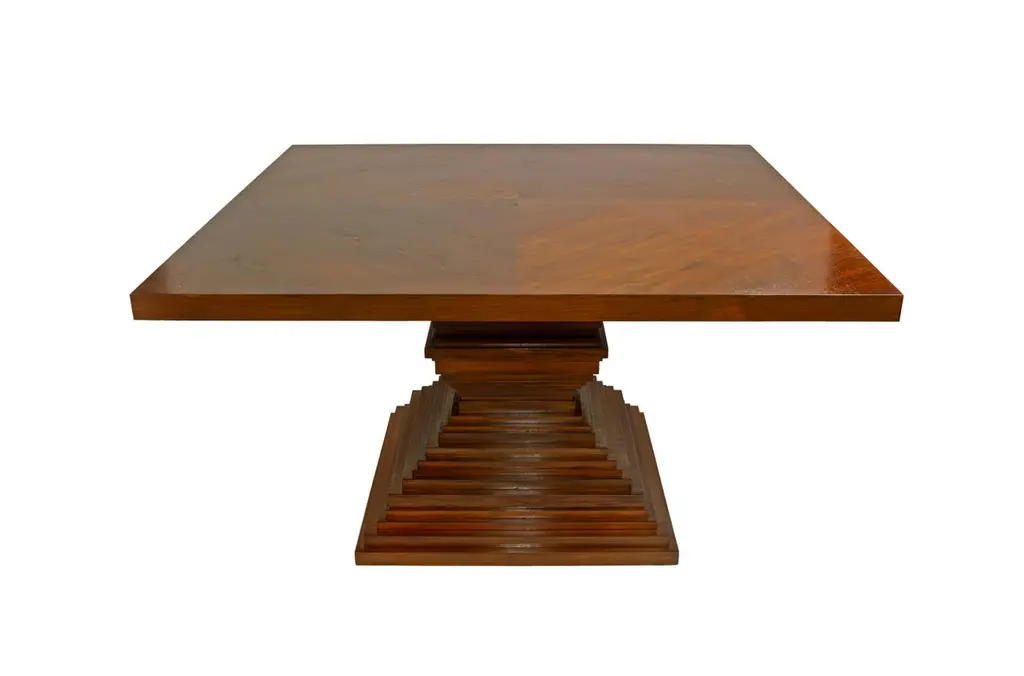 A handcrafted dining table. The original table is artfully composed of 29 individual disks; the impressive top is constructed of multiple sections of walnut or rosewood, creating a splendid sunburst, the table is crafted with traditional joinery in walnut, oak or rosewood veneer. Custom sizes and finishes available.