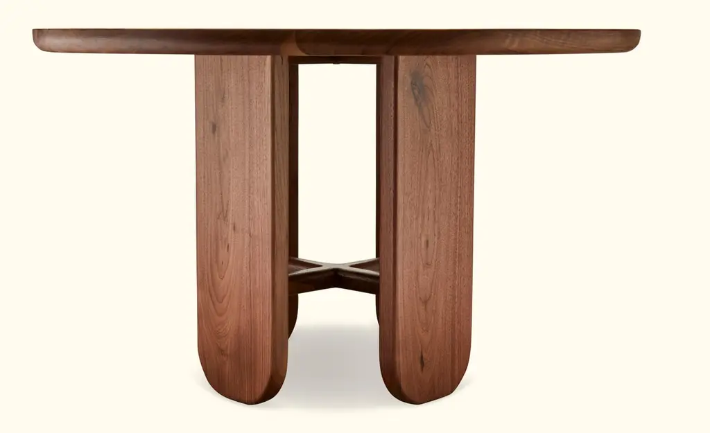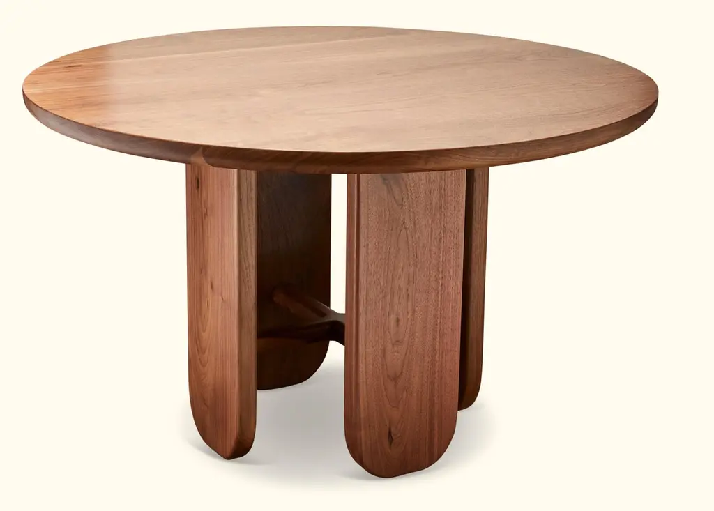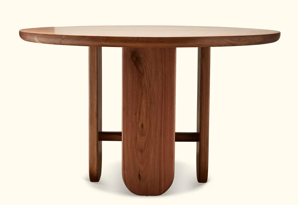 The rainier dining table is part of the collaborative collection with interior designer Brian Paquette featuring a parquet or solid wood top and four pedestal legs connected with a solid wood stretcher. Shown here in natural walnut. Available finishes may vary. The Lawson-Fenning Collection is designed and handmade in Los Angeles, California. Reach out to discover what options are currently in stock.