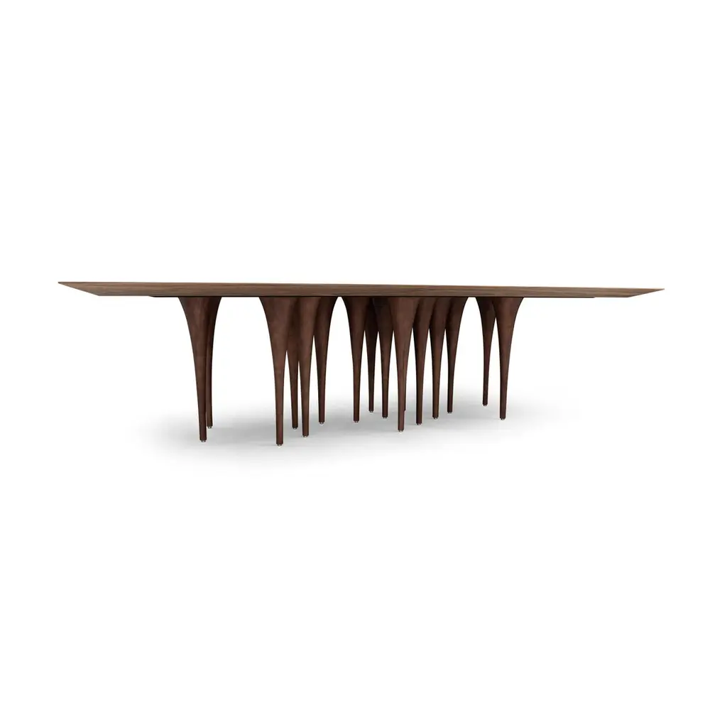 Architectural and dramatic, the Pin dining table by Uultis is a bold centerpiece defined by its sculptural silhouette and meticulously crafted detailing. Featuring a generously sized 118-inch walnut wood veneered top with dovetail detailing in its center, the table is supported by sixteen slender solid wood legs that flare upward like Gothic columns—creating a visually rhythmic base that’s both airy and monumental.The Pin table is a fusion of traditional craftsmanship and contemporary vision, equally suited for elevated residential interiors and commercial spaces. Its elongated rectangular form accommodates gatherings with ease, making it ideal for dining rooms, hospitality environments, or executive settings seeking a refined yet expressive focal point.Each leg is hand-shaped and positioned to offer maximum stability while maintaining the table’s striking visual flow. Designed by the Uultis team, the piece reflects the brand’s commitment to sustainability and environmentally responsible materials. The result is a timeless design grounded in natural inspiration and architectural elegance.Assembly required; step-by-step instructions and numbered accessories included for a smooth setup.