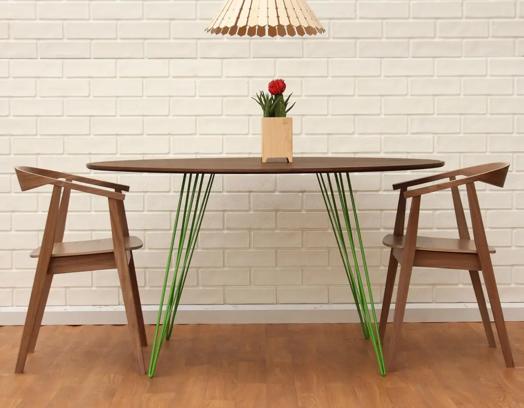 Walnut Williams Dining Table Green Hairpin Legs Oval Top