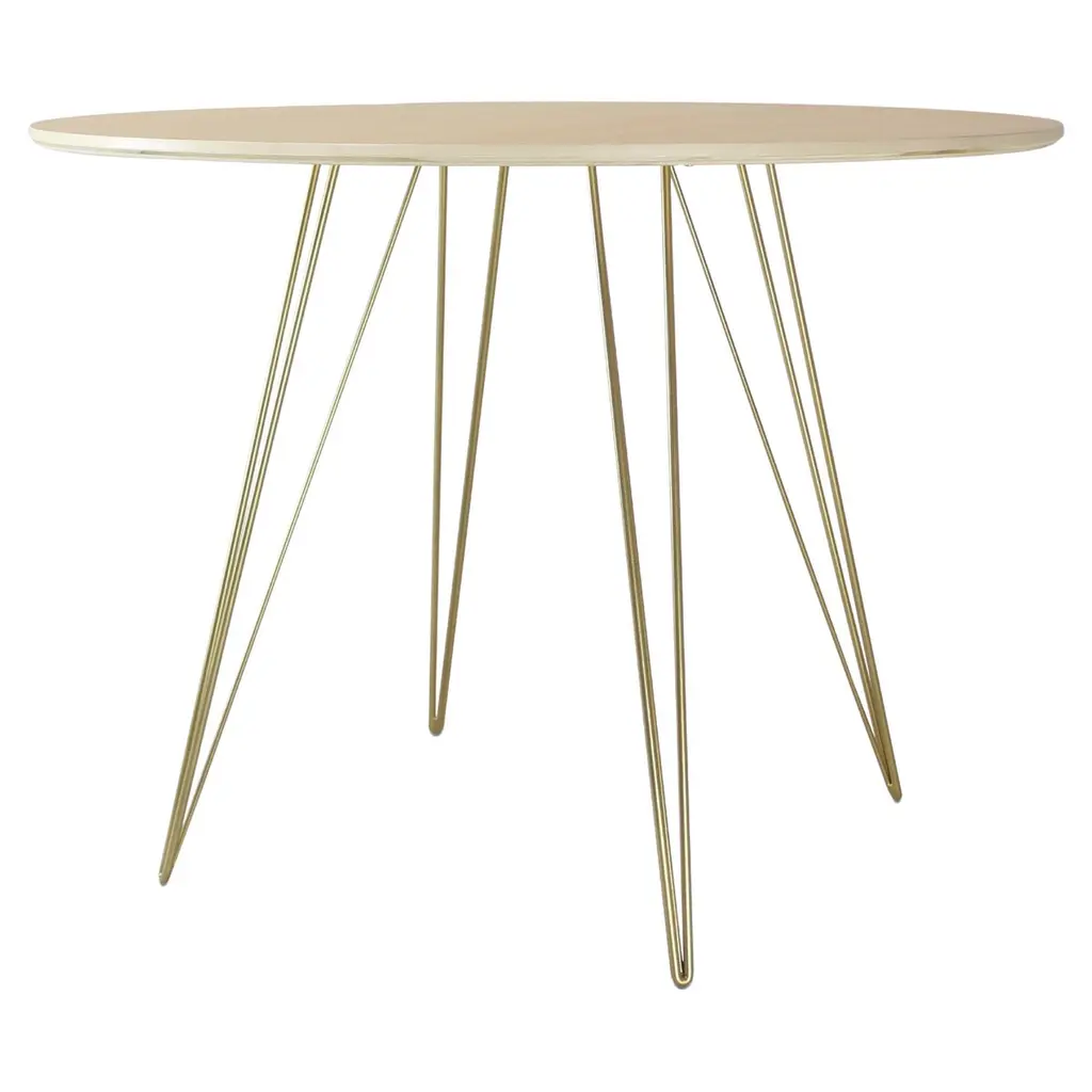 A thin, elegant and light table that can be customized to any shape, size and color desired. This handcrafted item perfectly blends industrial hairpin legs with a beveled wooden top. The irregular beauty of its natural wood combined with its simple elegant base creates a timeless, original design. This piece is offered in dinning and coffee heights as well as several shapes and sizes including large and small: rectangle, oval, square, and circle. Measures:- 46" x 54".