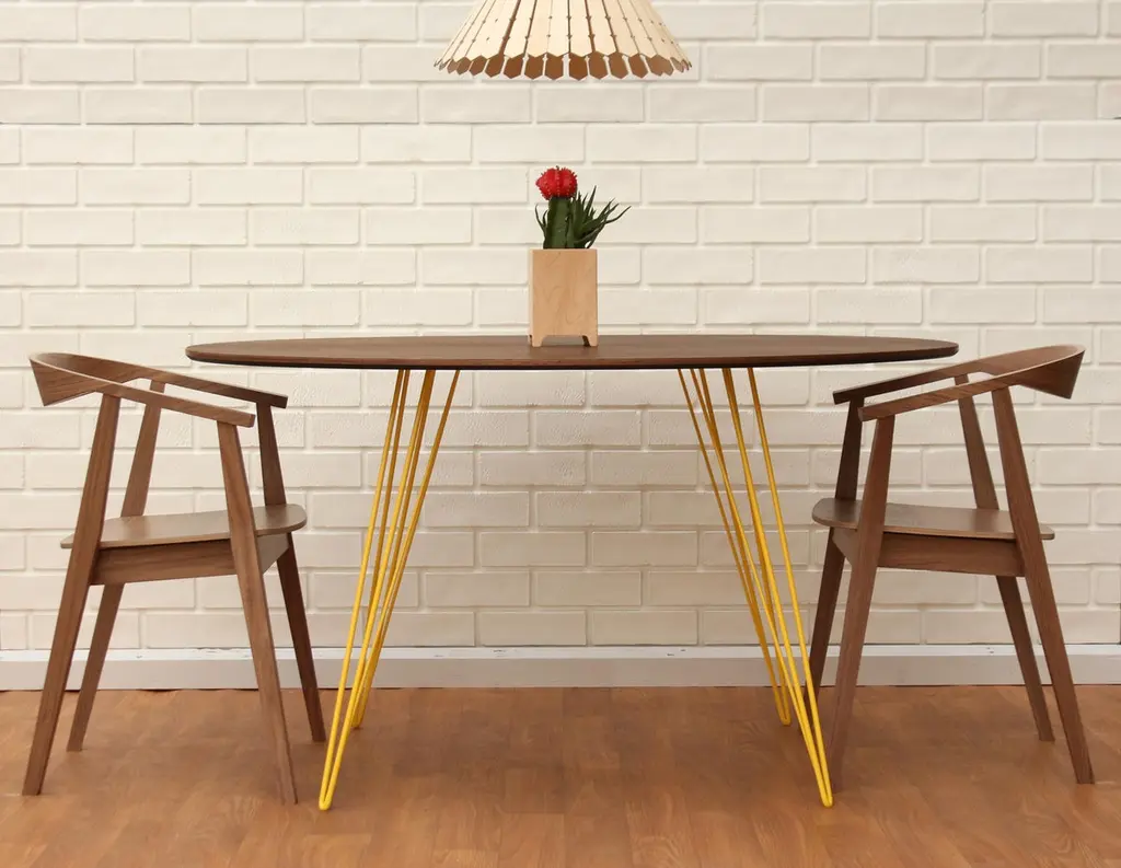 Walnut Williams Dining Table Yellow Hairpin Legs Oval Top