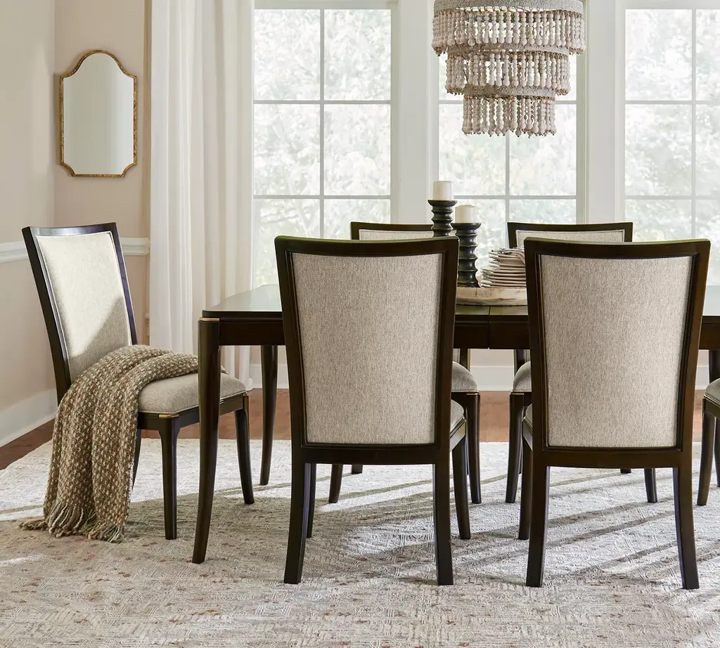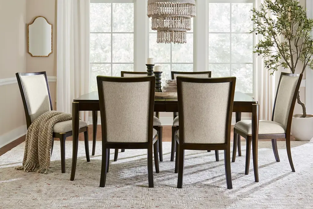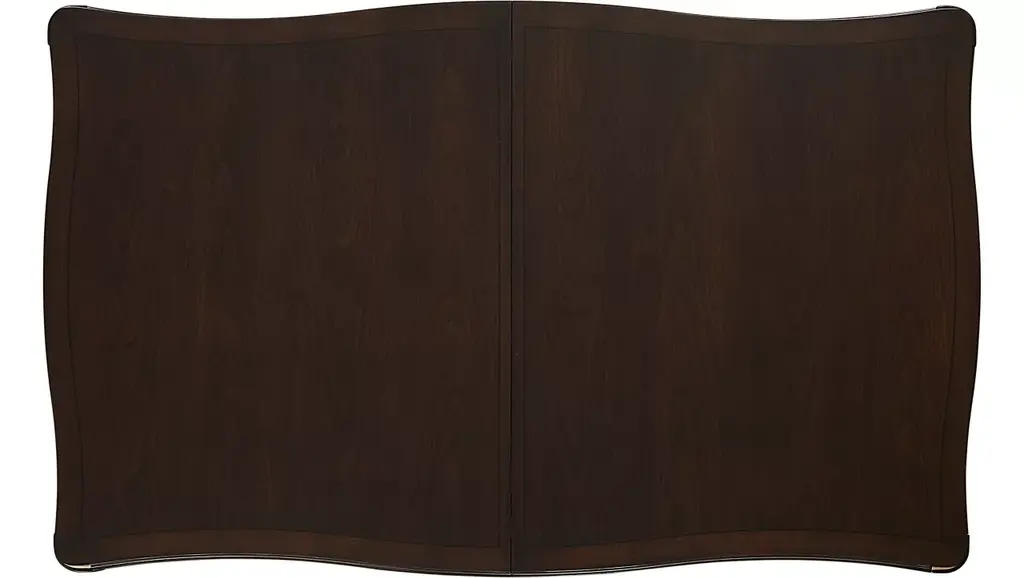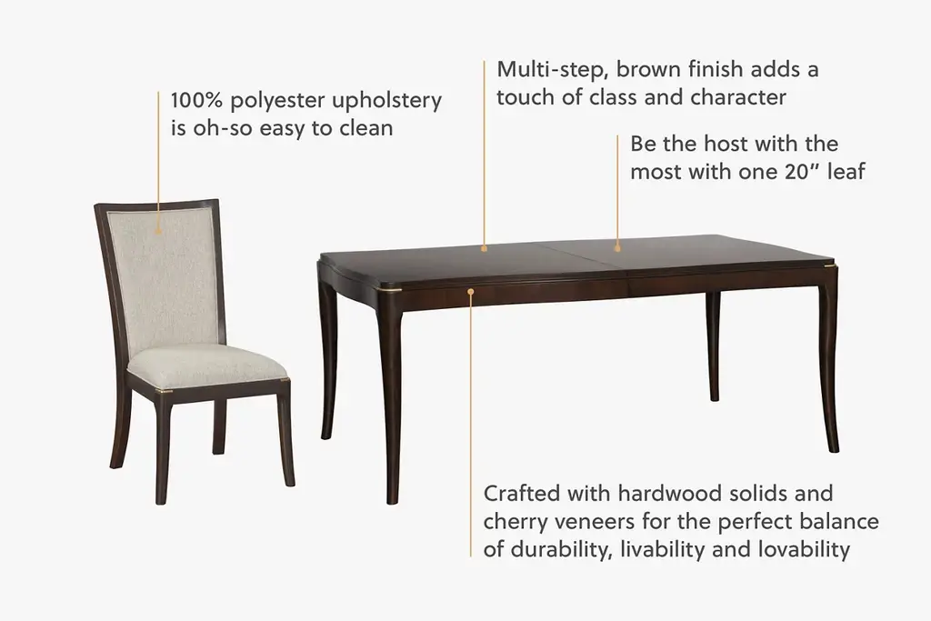 Create a dining experience that feels grand yet special each time with our Waterford dining table. Crafted with hardwood solids and cherry veneers, this rectangular dining table features a multi-step brown finish with book-matched, fancy face veneers and walnut inlay that add striking character to this piece. Cabriole legs and a gently curved silhouette add a traditional element while metal accents on the tabletop corners in a light brass finish bring a touch of contemporary style. Make room for large family gatherings with the 20" leaf that expands the table from 72" to 92" to accommodate your guests.