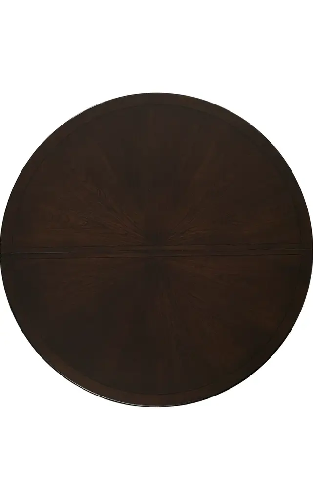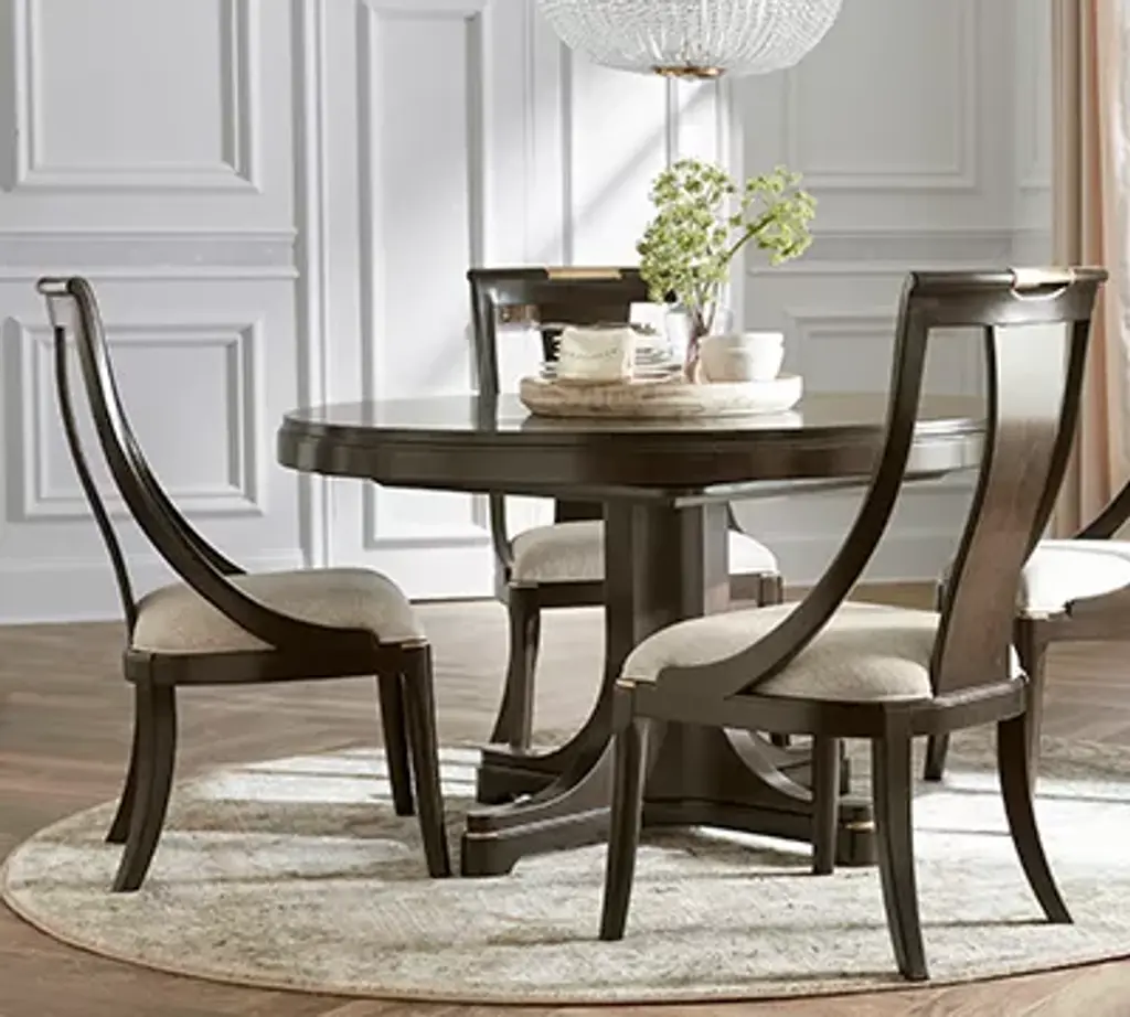 Make each family gathering feel exceptionally grand, yet intimate with our Waterford round dining table. Crafted with hardwood solids and cherry veneers, this round dining table features a multi-step, brown finish that enhances the character of the book-matched, fancy face veneers with walnut inlay. The pedestal base has a curved silhouette with metal accents in a light brass finish that offers a contemporary feel, while one 18" leaf expands the table from 54" to 72" to allow for more guests around the table.