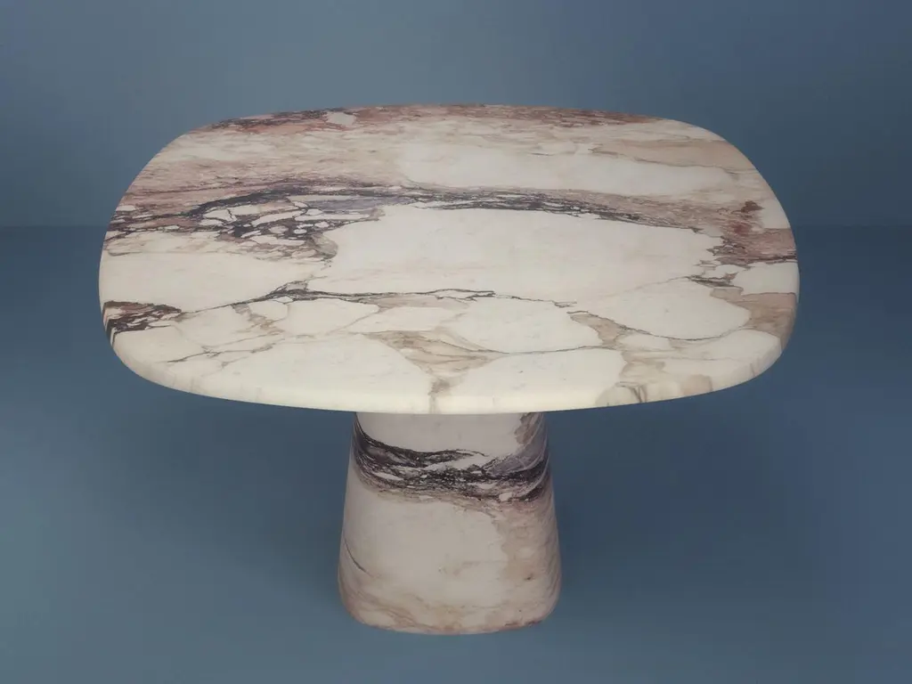 Wedge dining table by Marmi SerafiniMaterials: Marble, wood, metal.Dimensions: 130 x 130 H 75 cm.Top and leg in marble, support panel in wood not recessed and metal structure to fix it.Wedge table consists of a monolithic base with a tapered shape, where an important top rests.The lines are delicate and essential and every detail is deeply studied.The edges can be customized in two different ways: the first one is more linear with an inclination that clearly thins the thickness, instead the second one is softer and more rounded making people wish to touch the table.Thanks to its linear shape, the Wedge table fits any type of environment, enriching it with the always different and unique designs and shades of color that only marble has.Wedge can be customized with different sizes, materials and finishes, please contact us.Marmi Serafini is located in a small city named Chiampo, internationally well known for its marble production.It's origins stem from Mr. Bruno Fortunato's passion for marble which was then passed on to his two sons, Alessandro ad Luca, who eventually took over.Marmi Serafini has, with the passing of time, transformed into one of the most innovative marble factories, producing extremely design-driven products and objects..