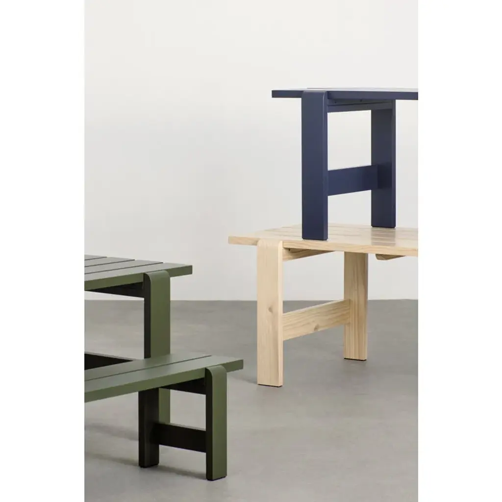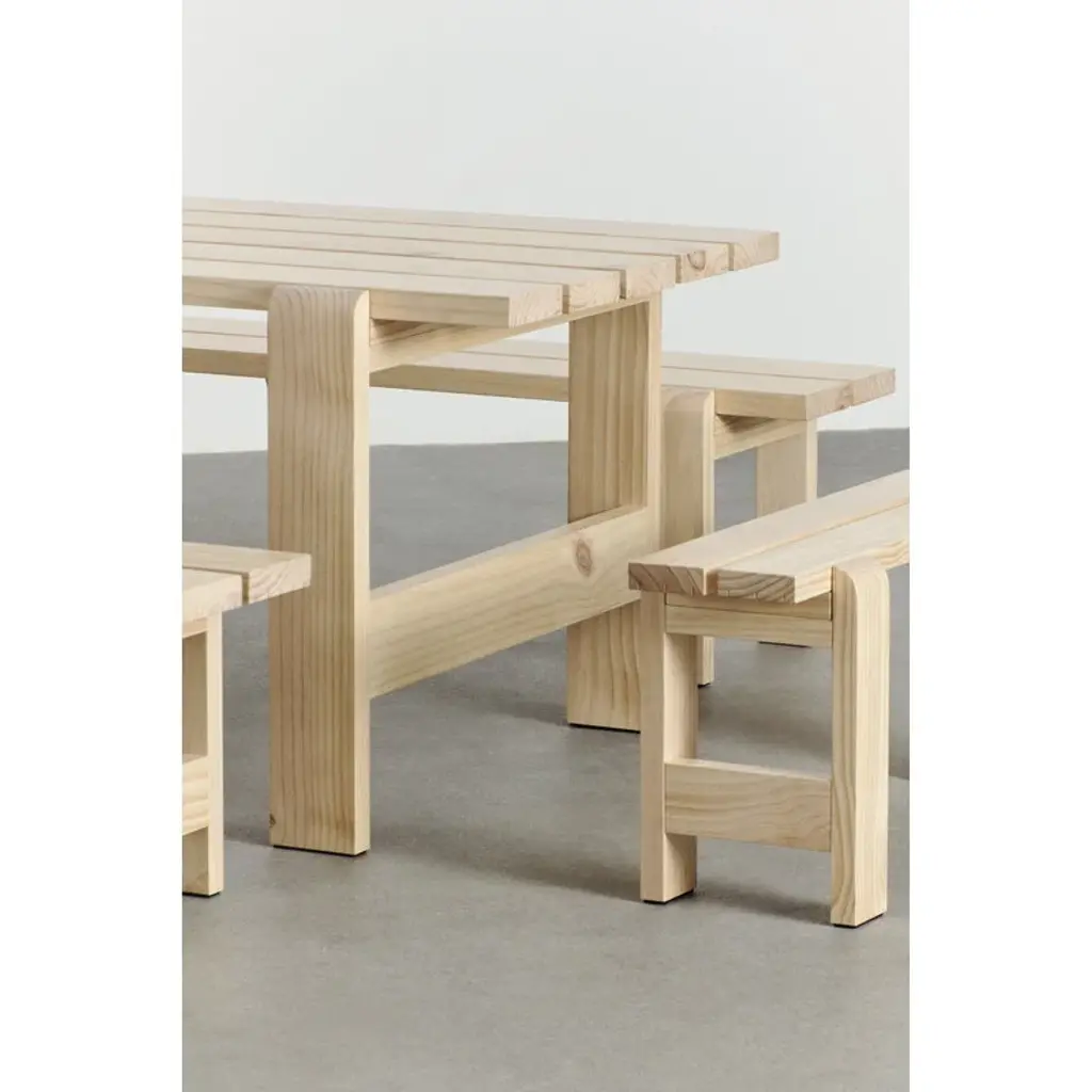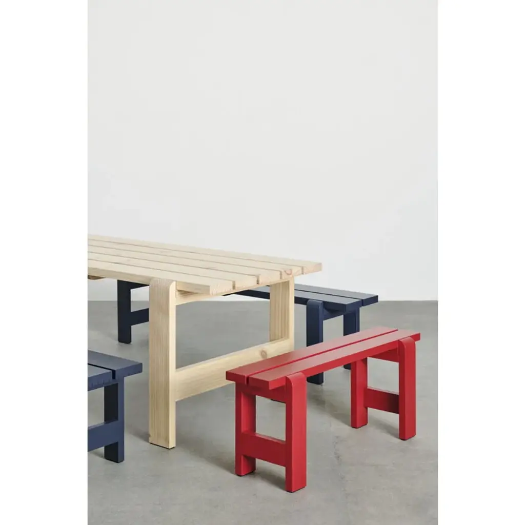 The Weekday table is part of HAY's collection of pine outdoor furniture. The table's recognizable, clean-lined look is a combination of massive legs and a slimmer table top. The dining table is a perfect match for the Weekday bench of the same design, but its simple look blends seamlessly with other materials and styles as well. The Weekday collection, created by Hannes & Fritz, is inspired by the idea of bringing people together to share both dinner and moments. The weather-proof finish keeps sure that the table is the centerpiece of barbecue evenings and outdoor dining, and the large tabletop can easily accommodate even a larger group of people. So feel free to invite an extra guest or two to your dinner party!