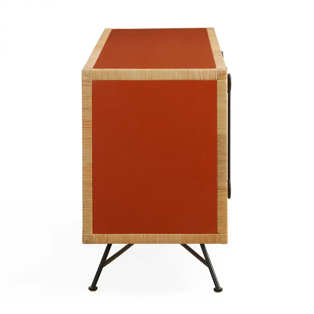 Breezy Glam.Riviera chic with equestrian edge and a hint of pop. Our Wellington Credenza features wrapped rattan peel edging inset with high-gloss orange lacquer all around. Perched n a sculptural blackened steel frame and fixed with blackened steel pulls with loop details. Couture storage that hits all the right notes whether in the hall, behind the sofa, or duetting with your dining table. Matching natural materials with a flash of couture color, our Wellington furniture collection is made for the modern jet-setter’s dream abode. Style with our Wellington lighting for chic and coordinated laissez-faire fabulousness.