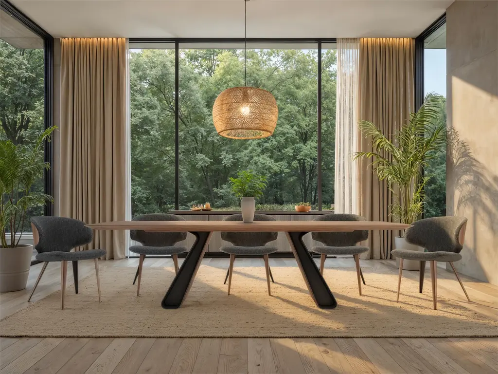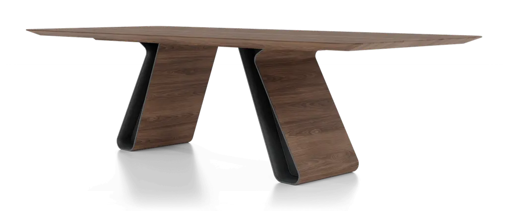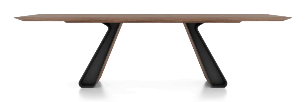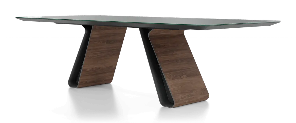It’s time to welcome sophistication to the table. Choose between a warm walnut top or a sleek graphite glass surface, each highlighting the metallic-painted base in its own way. Dual-tone legs with recessed details bring architectural character, while beveled edges soften the bold form. Spacious enough to seat ten, this table pairs elegance with presence.