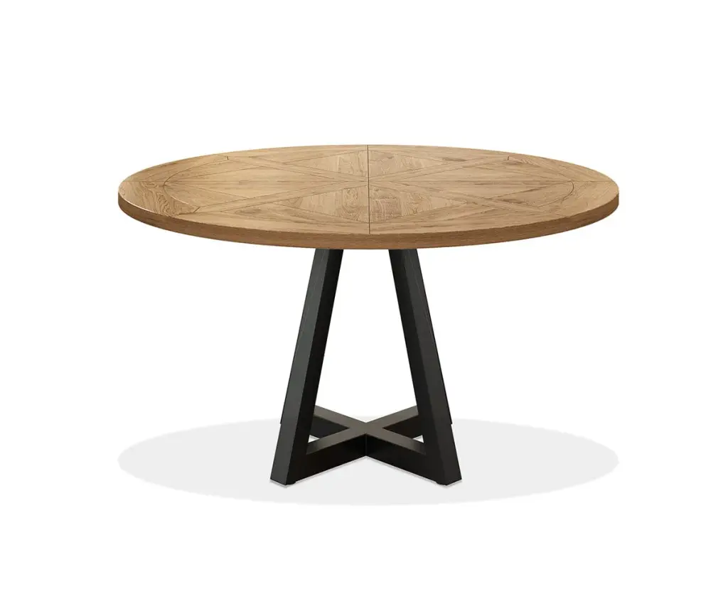 Enjoy your meals in style at the West Round Dining Table. This round table showcases a striking combination of wood and metal. The tabletop itself features a rustic parquet pattern complete with inlaid details, and industrial metal legs with precise angles support the entire piece. The West Collection infuses your spac