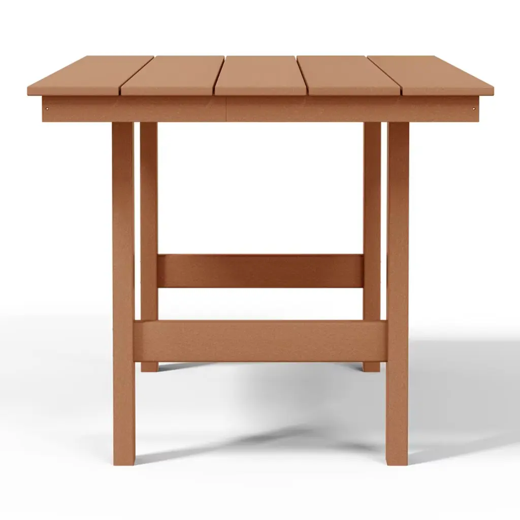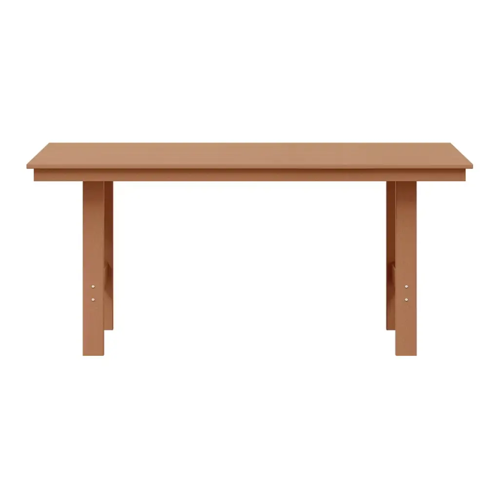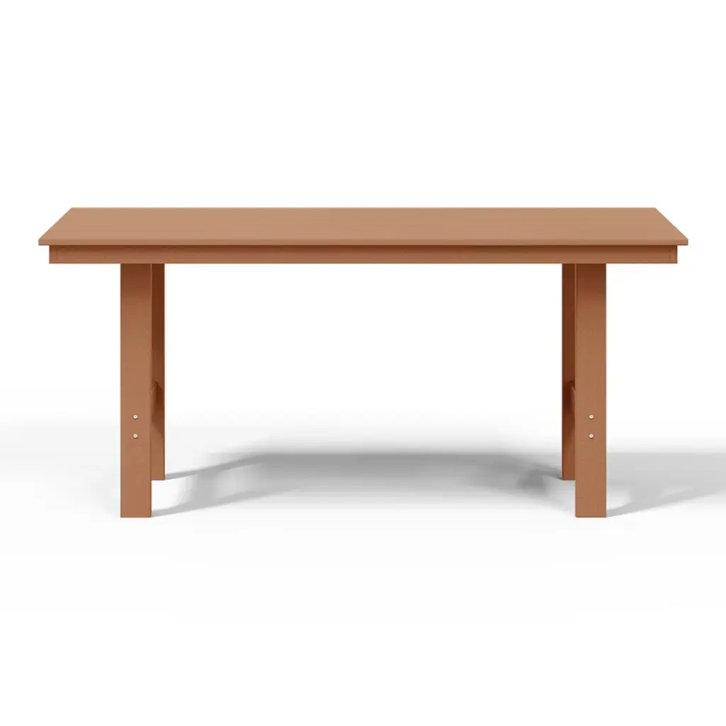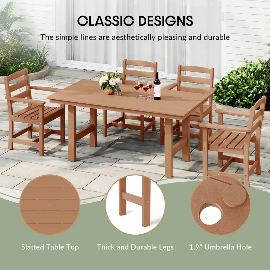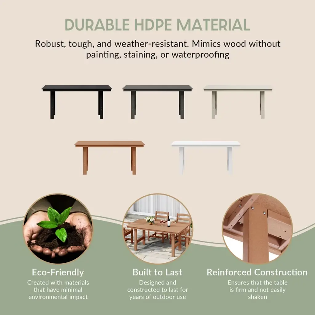 Gather around and make lasting memories with loved ones at our timeless 66" wide rectangular patio dining table. Made from premium, all-weather HDPE material, this table is designed to resist fading and UV damage, making it perfect for outdoor living. Embrace sun-filled days with ease, thanks to a thoughtfully designed 1.9" umbrella hole—ideal for adding your favorite patio umbrella. Crafted with a sleek, reinforced aluminum frame, this table is built to last, providing stability and reducing the risk of warping or wobbling for years of effortless enjoyment.While we strive to accurately represent product colors, please be aware that actual colors may vary slightly due to individual screen settings and lighting conditions. FeaturesConstructed from Durable HDPE Material and Designed to be Stable and SturdyWeather Resistant to Protect Against the Harsh Outdoor ElementsFade and UV Resistant to Protect Against the SunSturdy Color Matched Aluminum Rust Resistant Frame Ensures a Long Lasting and Durable Table Top and Helps Reduce WarpingThick and Sturdy Legs with a Beam Connection to Help Reduce Wobbling and Distributes WeightSeats Up to 6 Guest Comfortably with the Spacious 66" Wide Table Top with Space for all your Family MealsDurable and Tough with the All-Weather Material that is Resistant to Splinters, Cracking, or Peeling and Simple to Clean with Lukewarm Water, Mild Soap, and a Soft Bristle BrushDetails:Product Type: Patio Dining TablesWhat's Included: (1) Dining TableDining TableDimensions: 66" W x 34" D x 29.5" HWeight: 78 lbs.Weight Capacity: 300 lbs.