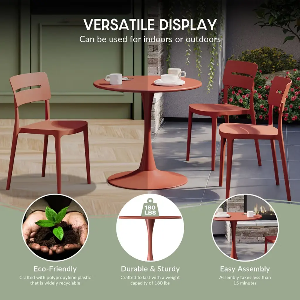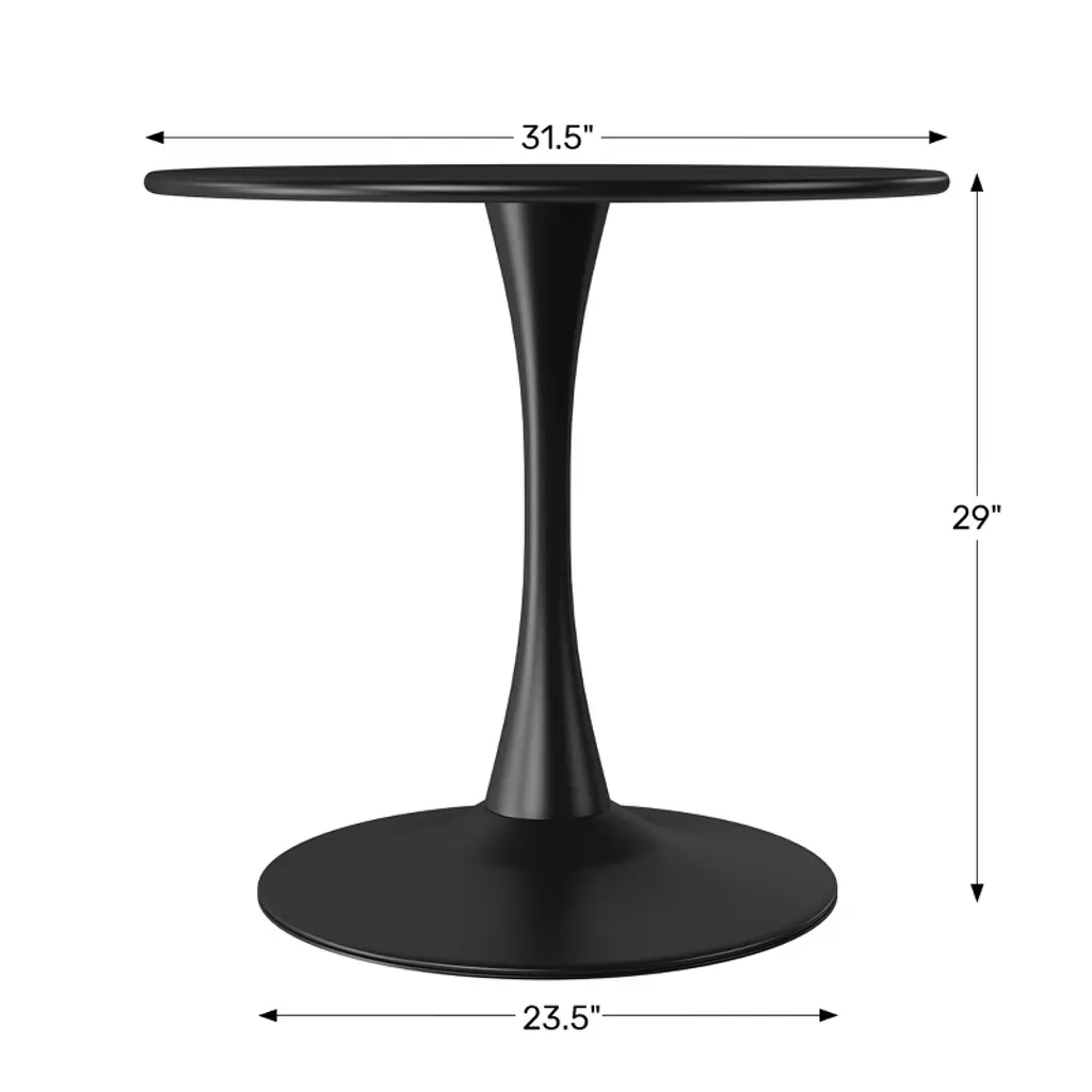 Bring a pop of vibrant color and modern simplicity to your outdoor moments with our 31.5" Round Metal Patio Bistro Dining Table. Crafted from sturdy metal with a clean, elemental form, this table offers lasting durability for your outdoor space. A resilient e-coating provides a smooth, enduring finish that resists scratches, fading, and the effects of the sun, keeping your piece looking fresh season after season. The 23.5" wide, flat base offers grounded stability. Perfectly sized at in diameter for intimate gatherings, it's ideal for sharing drinks and conversation on a balcony or patio. Designed for four, this bistro table is a charming focal point for your outdoor living and is also perfect for bring inside.While we strive to accurately represent product colors, please be aware that actual colors may vary slightly due to individual screen settings and lighting conditions. FeaturesCrafted from sturdy metal, the tabletop and base offer exceptional durability & simple to assemble with 4 easy stepsE-coating ensures rust resistance and protection against all weather elementsFeatures a charming aesthetic and a stable pedestal foundationScratch-resistant for protection against everyday scratches and scuffs23.5" Wide, flat base for exceptional stability and minimal wobblingRounded edges for added safety against pricks and scratchesGenerous 31.5" tabletop easily accommodates drinks and appetizersDetails:Product Type: Patio Dining TablesWhat's Included: (1) Dining TableDining TableDimensions: 31.5" W x 31.5" D x 29" HWeight: 27.25 lbs.Table Top Width: 31.5"Table Top Depth: 31.5"Table Top Thickness: 0.75"Weight Capacity: 180 lbs.