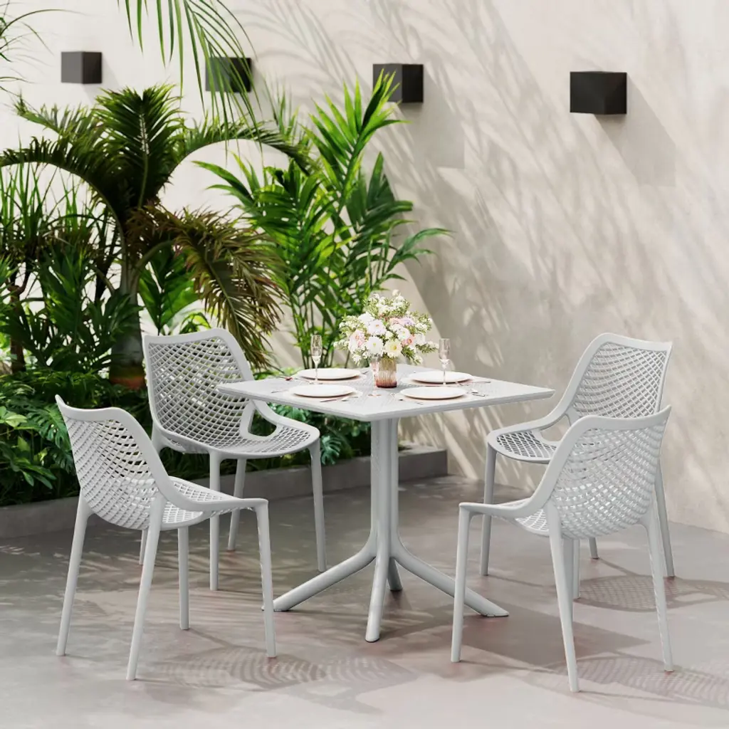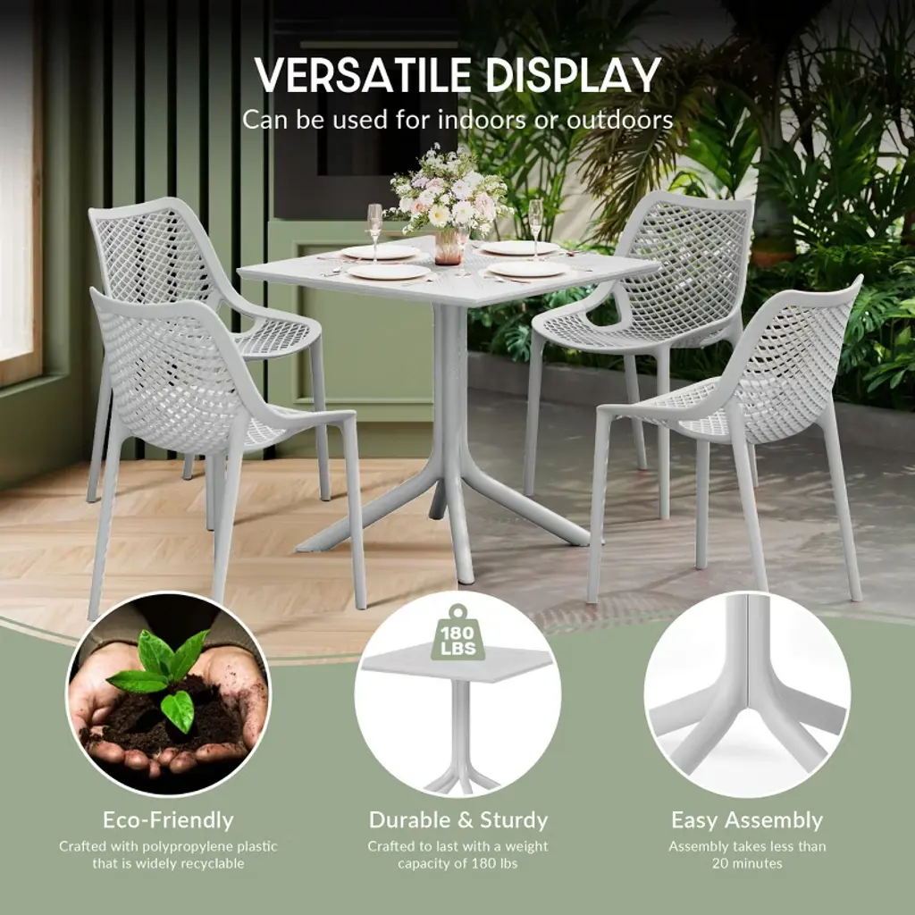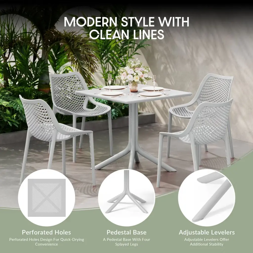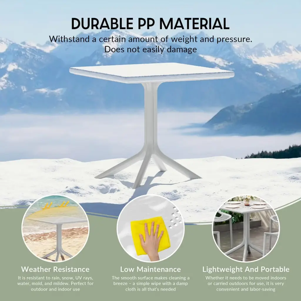 Transform even the smallest patio or balcony into a cozy dining retreat with this chic 31" square outdoor dining table. Crafted from all-weather polypropylene (PP), it’s UV and fade-resistant—designed to stand up to the elements while maintaining its sleek, modern look. Lightweight and easy to move, it's the perfect fit for compact spaces. The durable pedestal base is equipped with adjustable levelers for added stability on uneven surfaces, while the reinforced cross-braced tabletop design enhances strength and structure.While we strive to accurately represent product colors, please be aware that actual colors may vary slightly due to individual screen settings and lighting conditions. FeaturesConstructed with Durable Polypropylene (PP) Material and Designed for Sturdiness and StabilityAll-Weather Resistant Material Made to Last the Harsh OutdoorsUV and Fade Resistant to Maintain its Vibrant Color Year-RoundSturdy and Durable Pedestal Base for Enhanced Stability and Even Weight DistributionReinforced Cross-Bracing Ensures a Strong and Stable Tabletop to Withstand Daily UseAdjustable Foot Levelers Provide Stability on Uneven Floors and Prevent WobblingVentilated Tabletop Allows for Quick Water Drainage and DryingDetails:Product Type: Patio Dining TablesWhat's Included: (1) Dining TableDining TableDimensions: 31.5" W x 31.5" D x 29.25" HWeight: 24.25 lbs.Table Top Width: 31.5"Table Top Depth: 31.5"Table Top Thickness: 1"Weight Capacity: 180 lbs.