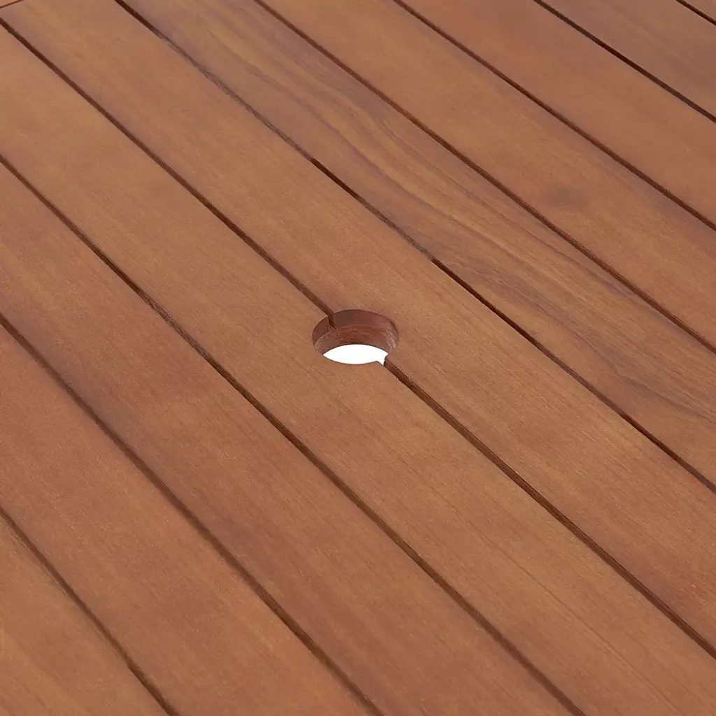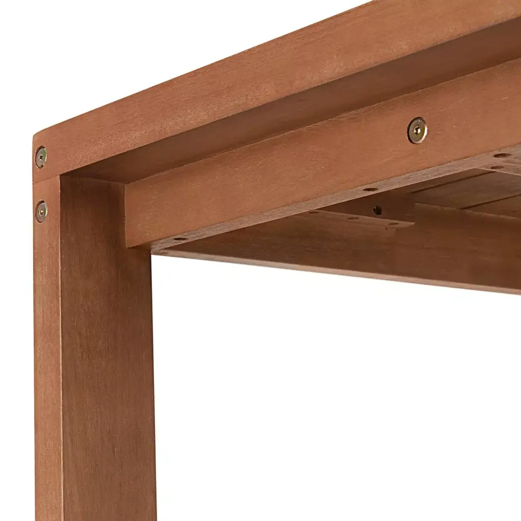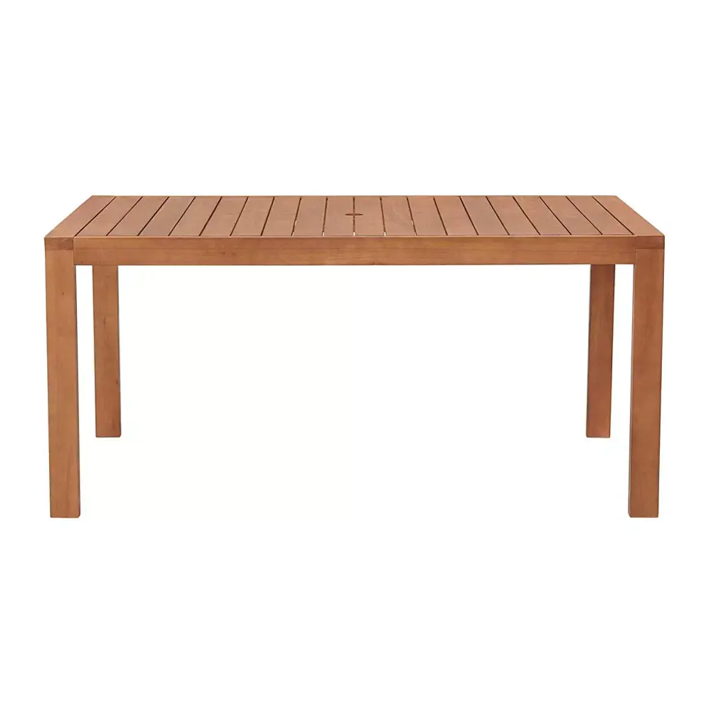 Gather with friends and family to enjoy conversations or meals outside with this stylish wood outdoor dining table. Its clean lines and simplicity add refinement to any patio setting. Frame is made from durable eucalyptus wood that will stand up to varying weather conditions. The neutral wood finish will easily match with any accent pieces in your outdoor space, or pair this beautiful dining table with other items in the collection for the perfect outdoor entertainment space!