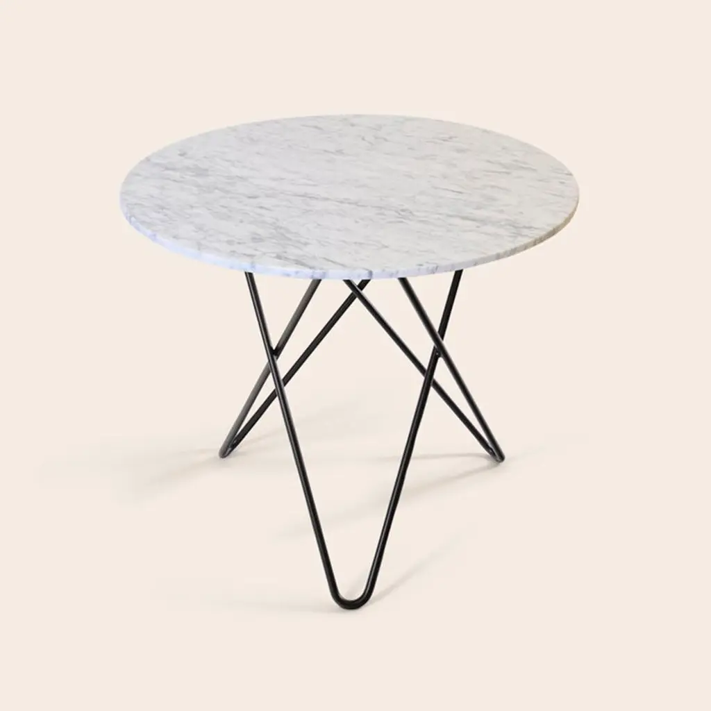White carrara marble and black steel dining O table by Ox DenmarqDimensions: D 80 x H 72 cmMaterials: steel, white carrara marbleAlso available: different marble and frame options available.Ox Denmarq is a Danish design brand aspiring to make beautiful handmade furniture, accessories and lighting in natural high-quality materials in fair prices. " When we set out back in 2003, we were primarily working with vegetable-tanned saddle leather thus the name OX was a tribute to our unique leather and the animal providing it.The other half of our name, Denmarq, is chosen to emphasize that we are a Danish design brand based on the Danish design tradition and that most of our furniture is produced in Denmark. However, DENMARQ not only refers to our home country, but also to the co-founder and designer - Dennis Marquart.Before finishing his design studies at the Copenhagen Design University, Dennis Marquart did a Blacksmith education. This background is extremely useful when developing and designing products."Ox Denmarq handmade products will only get more beautiful as time passes and natural patina sets in.Many OX products are shaped around marble or vegetable-tanned saddle leather. Stone and leather are materials that will, and should, get marks over time. But they will also age with a very special beauty. When you learn to appreciate the beauty of maturity and of time passing, you have learned to appreciate patina the way it should be appreciated.