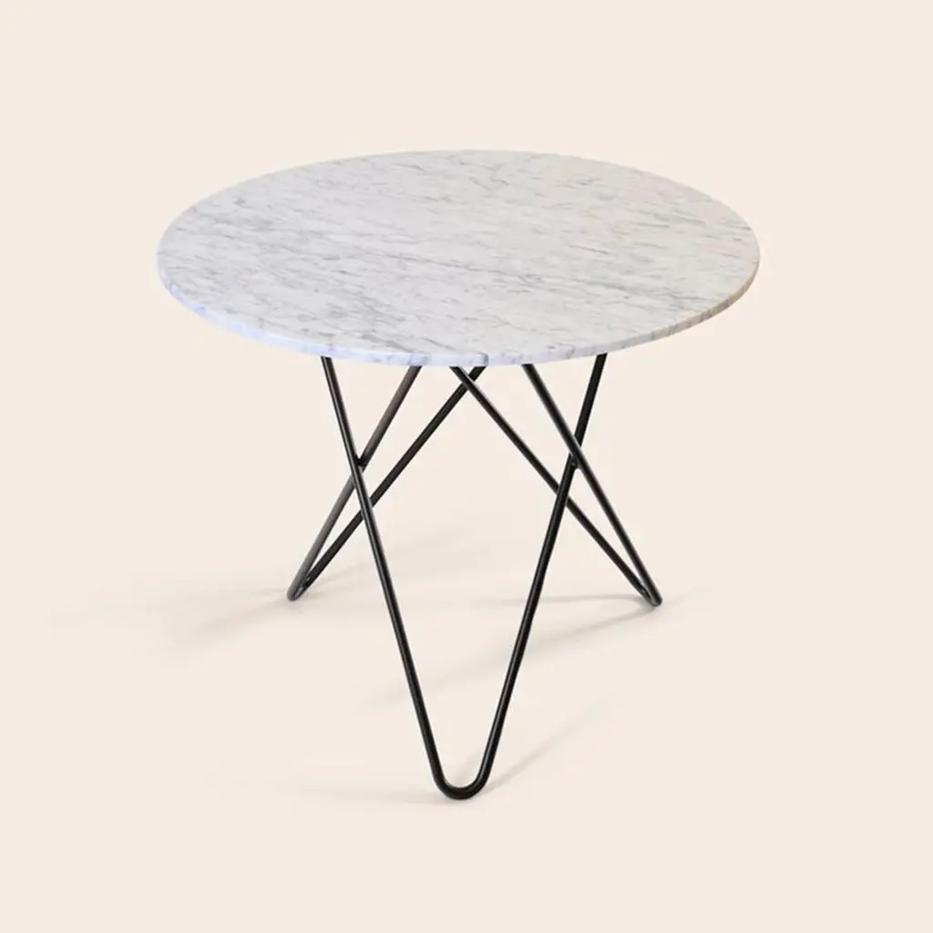 White Carrara Marble and Black Steel Large Dining O Table by OxDenmarqDimensions: D 100 x H 72 cmMaterials: Steel, White Carrara MarbleAlso Available: Different marble and frame options available,OX DENMARQ is a Danish design brand aspiring to make beautiful handmade furniture, accessories and lighting in natural high-quality materials in fair prices. " When we set out back in 2003, we were primarily working with vegetable-tanned saddle leather thus the name OX was a tribute to our unique leather and the animal providing it.The other half of our name, DENMARQ, is chosen to emphasize that we are a Danish design brand based on the Danish design tradition and that most of our furniture is produced in Denmark. However, DENMARQ not only refers to our home country, but also to the co-founder and designer - DENnis MARQuart.Before finishing his design studies at the Copenhagen Design University, Dennis Marquart did a Blacksmith education. This background is extremely useful when developing and designing products."OX DENMARQ handmade products will only get more beautiful as time passes and natural patina sets in.Many OX products are shaped around marble or vegetable-tanned saddle leather. Stone and leather are materials that will, and should, get marks over time. But they will also age with a very special beauty. When you learn to appreciate the beauty of maturity and of time passing, you have learned to appreciate patina the way it should be appreciated.