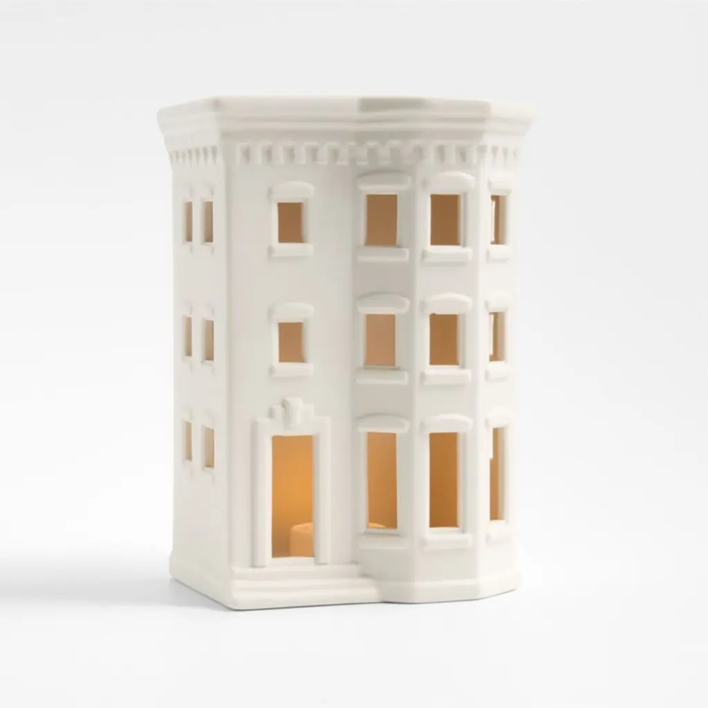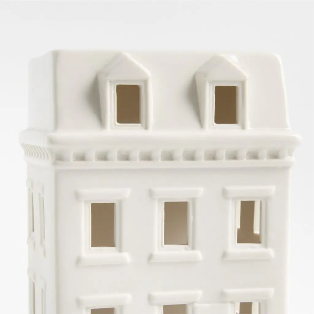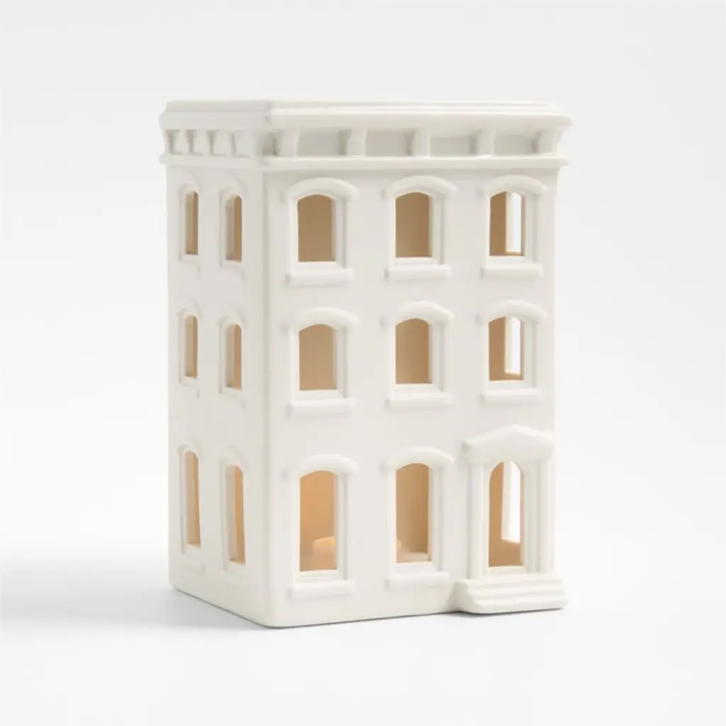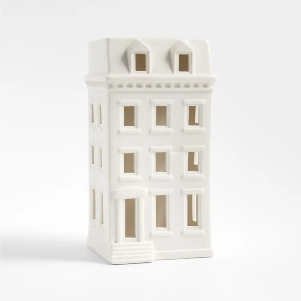 Our snow-white ceramic brownstone reimagines the iconic architecture of New York City in a clean, linear style that suits modern winter decor. This rowhouse is based on the Federal style, epitomized by the restrained ornamentation that makes it a timeless classic. When filled with a tealight, a warm glow spills through the cutout windows for the inviting look of a snug, light-filled apartment building. Style with our other exclusive stoneware brownstones to create a cozy neighborhood on your mantel, buffet or dining room table.