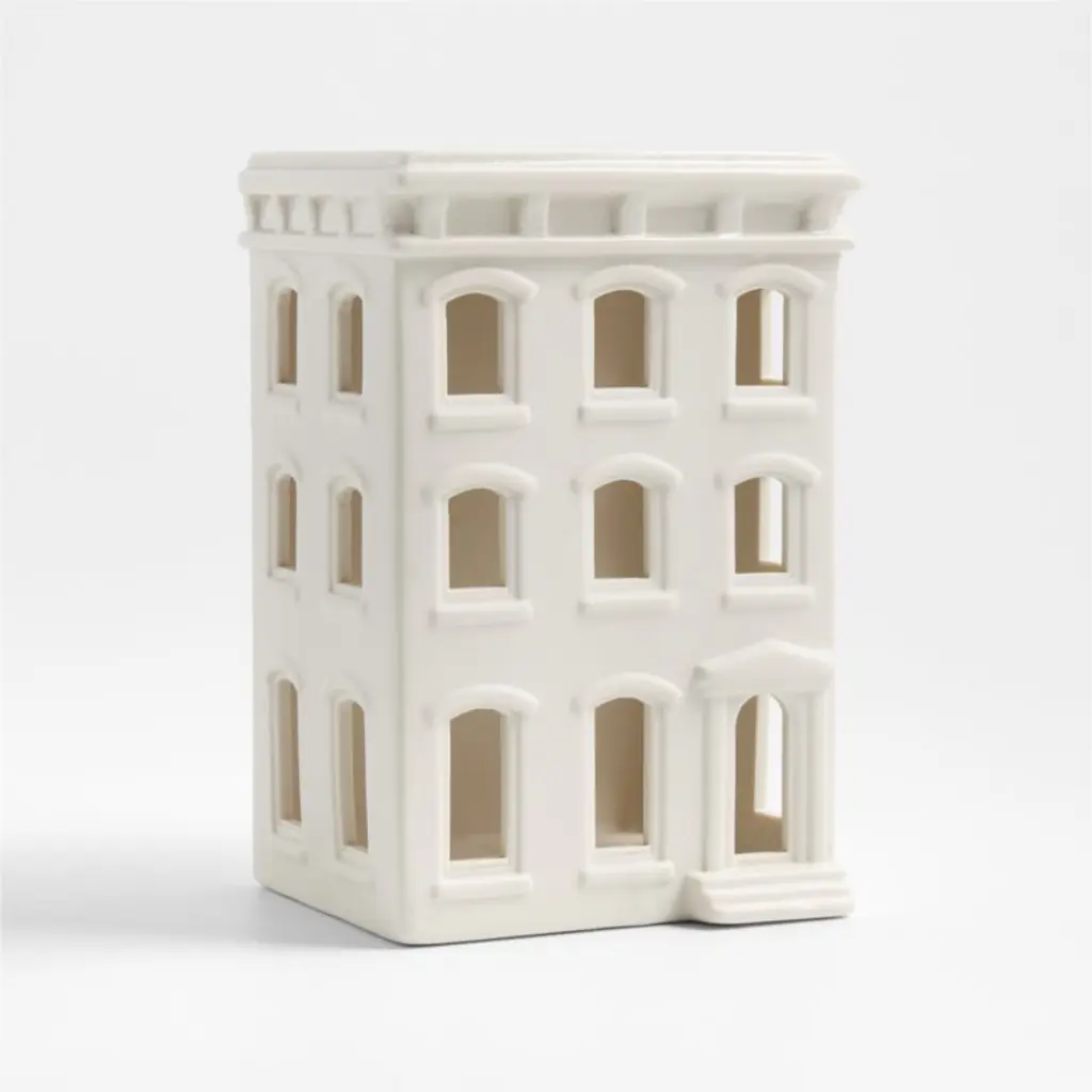 Our snow-white ceramic brownstone reimagines the iconic architecture of New York City in a clean, linear style that suits modern winter decor. This rowhouse is based on the arched windows and ornamental cornices of the Italianate style popular in the second half of the 19th century. When filled with a tealight, a warm glow spills through the cutout windows for the inviting look of a snug, light-filled apartment building. Style with our other exclusive stoneware brownstones to create a cozy neighborhood on your mantel, buffet or dining room table.