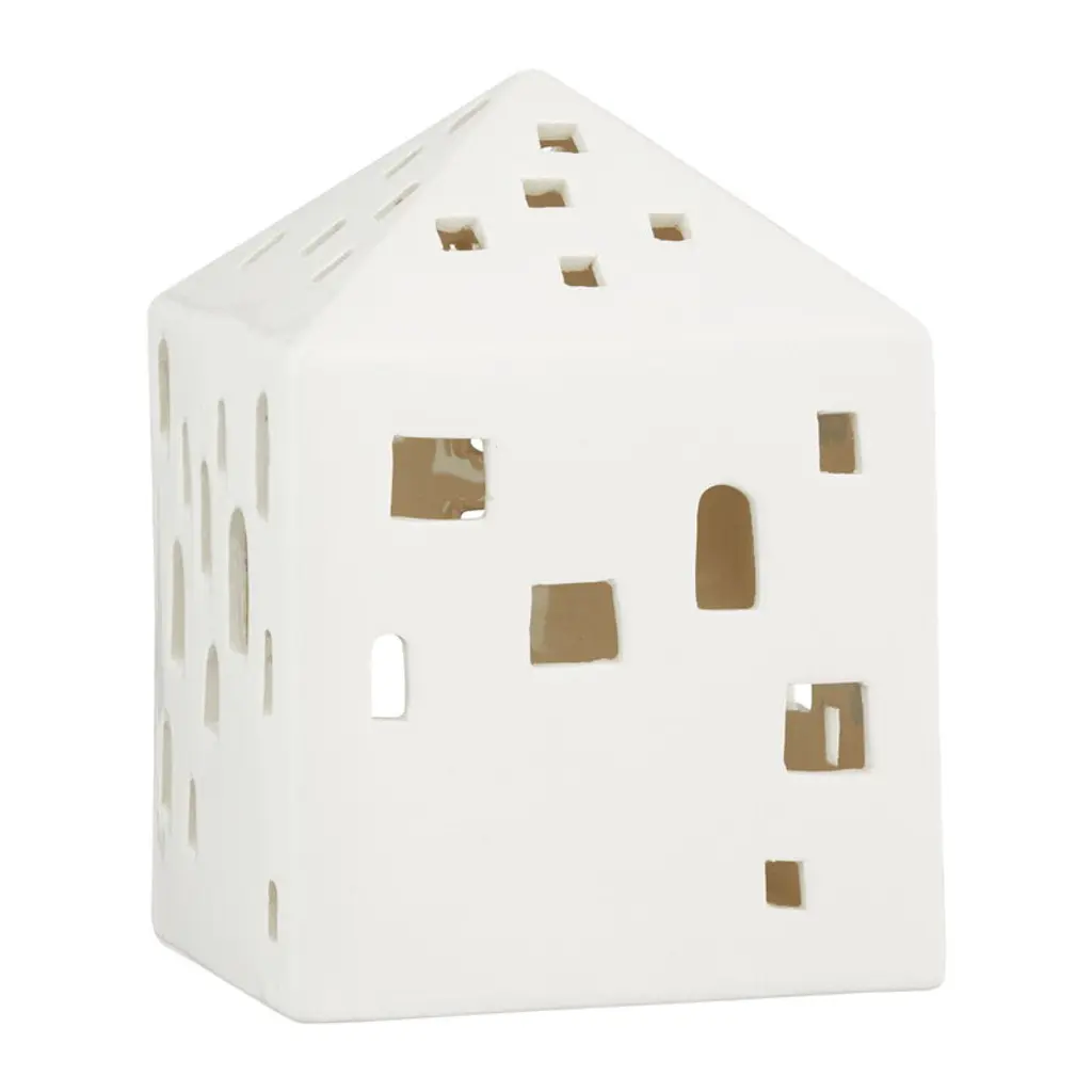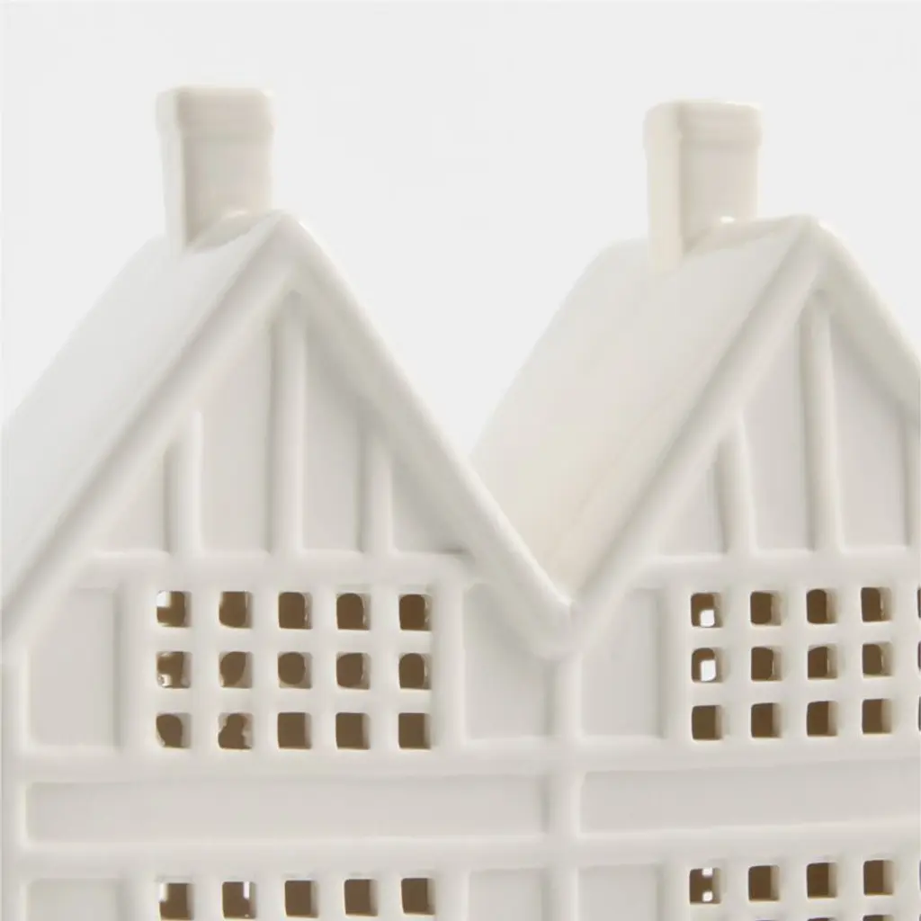 Our snow-white ceramic shop reimagines the fairy tale charm of Tudor architecture in a clean, linear style that suits modern winter decor. When filled with a tealight, a warm glow spills through the cutout windows for the inviting look of a light-filled storefront bustling with holiday shoppers. Style with our other exclusive stoneware buildings to create a cozy village on your mantel, buffet or dining room table.