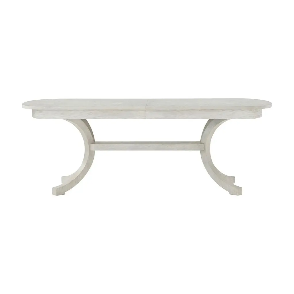 Bring refined elegance to dining spaces with its graceful lines and exquisite craftsmanship. Crafted from fine oak and finished in a breezy Dover white, this extension table offers a sophisticated nod to 19th-century design while embracing modern coastal simplicity. Its elegantly curved base evokes Regency-era saber legs, lending a sculptural presence beneath the expansive tabletop.Two 18-inch leaves allow the table to extend up to 120 inches, providing ample space for gatherings both intimate and grand. A gently rounded top adds softness to the clean silhouette, while the whitewashed finish highlights the oak's natural grain with subtle warmth and texture. Perfect for airy interiors and timeless dining spaces.Dimensions: 120" W x 48" D x 30" HClosed: 84" W x 48" D x 30" Hwith two 18" leaves.