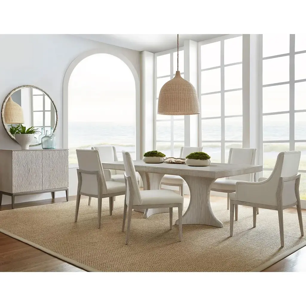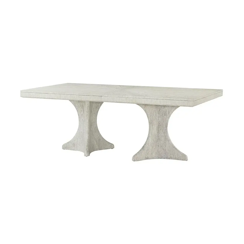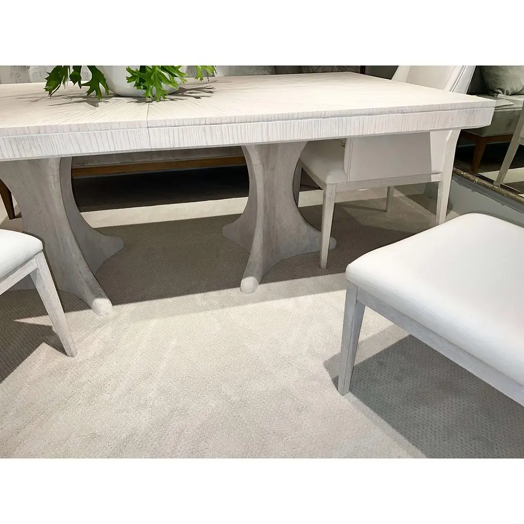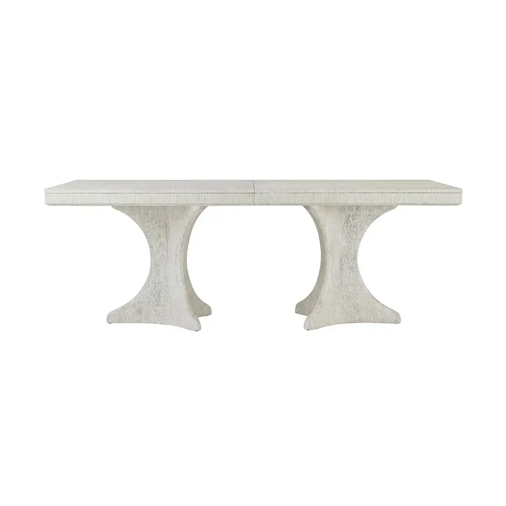 Coastal Extension Dining Table, a rectangular dining table crafted with wire-brushed cerused pine in our Sea Salt finish. This is the perfect dining space to seat eight guests and will extend for a group of ten. Seen here with a solid hourglass pine double pedestal base with a vibrant sunburst veneer pattern on top. Open dimensions: 118" x 44" x 30" H Closed dimensions: 82" X 44" X 30" H