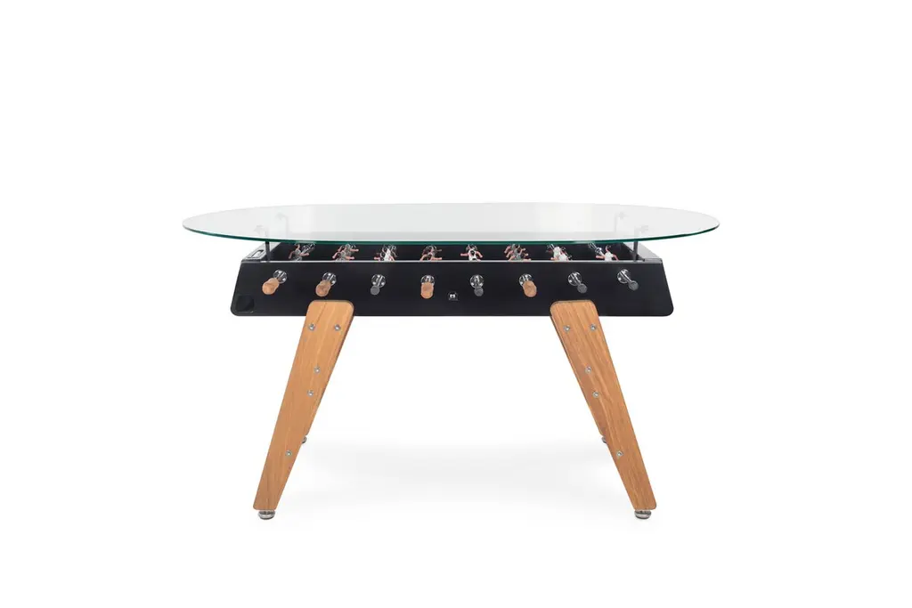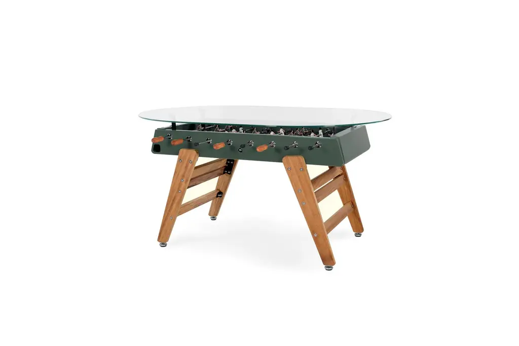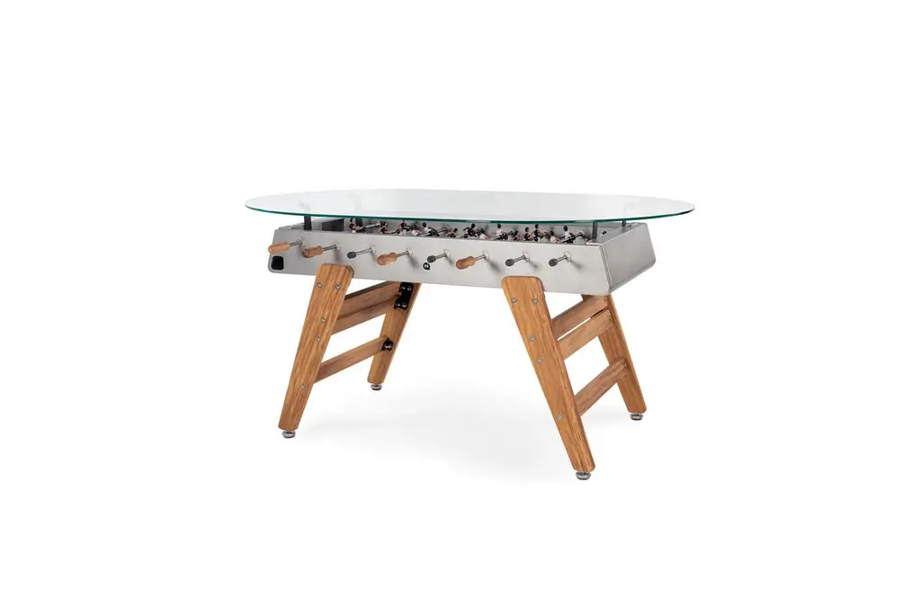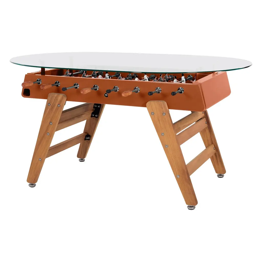 RED FOOSBALL DINING GAME TABLE RS3 WOODDESIGNED BY RAFAEL RODRÍGUEZ for RS BarcelonaWith the RS3 Wood football dining table, a new player enters the game. Playtime with a touch of wood. A warmer design for those who know that the combination of two good ingredients always produces super results.RS3 WOOD is a design football dining table, a spectacular reinterpretation of one of the all time classics of Spanish game culture, specially dedicated to all those children who at one time or another said that “Adults don’t play, just work”For Residential & Commercial use. Offices HospitalityIntense useIndoor & OutdoorCustomisation optionsAlmost assembledDesigned & Manufactured in SpainThe RS3 Wood is an indoor and outdoor Foosball dining table, so you can have it both in the dining room or in the game room, as well as on the terrace or in the garden. Each color (white, black, green and light grey-inox) comes with standard team kits. But the RS3 Wood is also a customizable Foosball table and you can play with your favorite teams.It comes with the field a little bit concave, so the ball doesn't stop moving, this way the game is more dynamic.You can choose the line-up (3-3-4 or 2-5-3), the color of the field, if the players are 1 or 2 feet or if you want them to be boys, girls or mixed teams and even the skin color. So you can design your own RS3 Wood and make it a unique piece.The RS3 Wood is an RS Barcelona Foosball table, a brand of intense living products. Products which, with a high design value, high-quality materials and functionality, offer innovative solutions through a combination of the fine details of craftsmanship and the precision of industrial manufacturing.RS Barcelona’s products are much more than products. They’re experiences. They’re unforgettable and unique moments. They’re a way of understanding and approaching life that can be summed up in one pledge: intense living.Colors: Inox, white, black, terracotta, blue, greenFavorite teams. Line-up (3-3-4 or 2-5-3)Color of the fieldPlayers: 1 or 2 feet; boys, girls or mixed teams, skin colorQuick Ship (2-3 weeks) for white and black colors. Standard team kitsEstimated Delivery time: 9-10 weeks for custom orders and other colorsStructureShot blasted stainless steel lacquered.LegsIroko wood.FieldHPL.PlayersCast aluminium.HandlesWood.Measures (LxWxH)151x128x92 cm / 59.5x51x36 inWeight78 kg / 172 lbBall set7 units (5 standard balls and 2 silent balls).4 extra players2 per team.MaterialsInox finish: Shot blasted stainless steel lacquered.RAL colour finish: Steel with cataphoretic coating process and micro textured powder coated polyester paint.Glass: 0.4 in 1 cm tempered glass. Field: HPL (green, cream or black). Legs: FSC/PEFC certificated iroko wood. Players: Cast aluminium.Handles: FSC/PEFC certificated iroko wood. IncludesBalls set (7 units)2 extra players (1 for team)Product weight295.4 lb 134 kgPackaging dimensions and weightFor the Foosball table:1 Package: 160x134,6x55,9 cm / 110kgsFor the Oval glass:1 Wooden crate: 204152x22cm / 130kgsFor the Rectangular glass:1 Wooden crate: 17114022cm / 124kgs