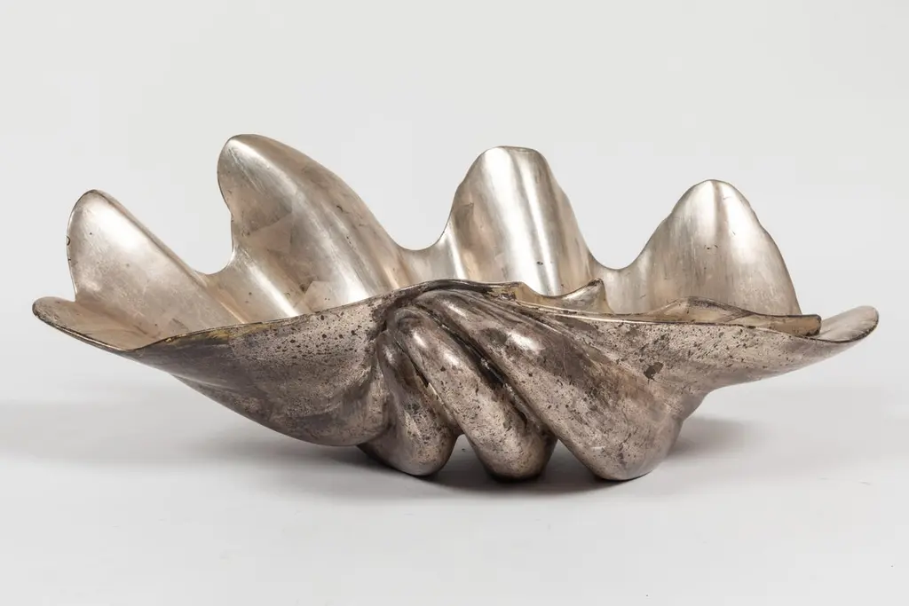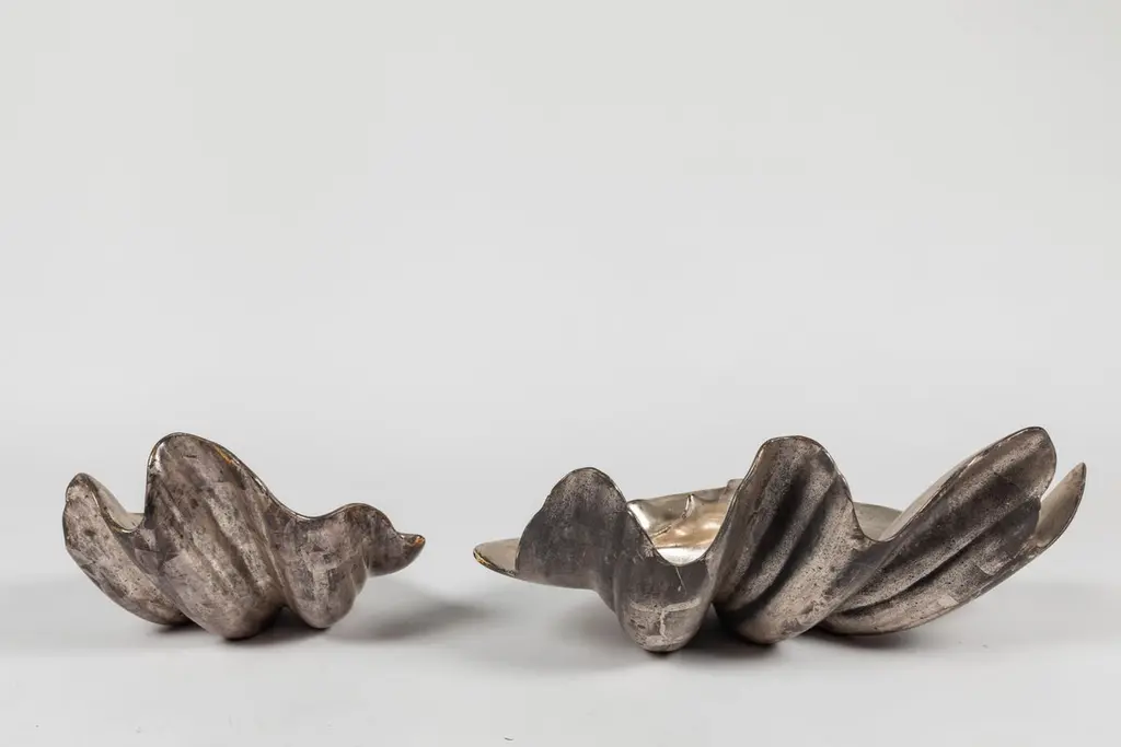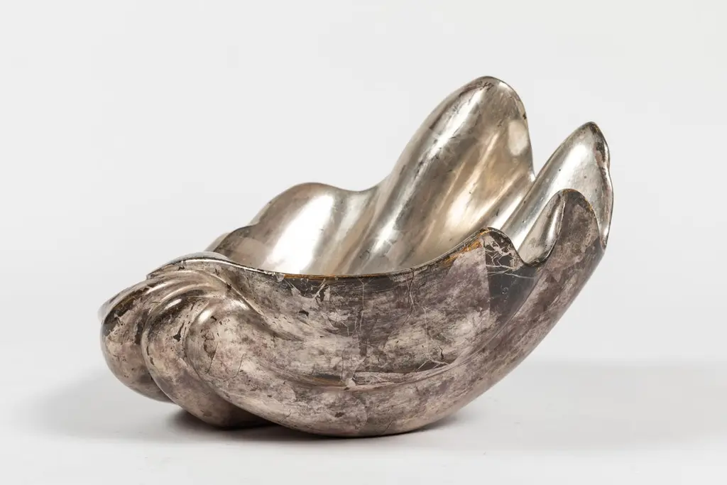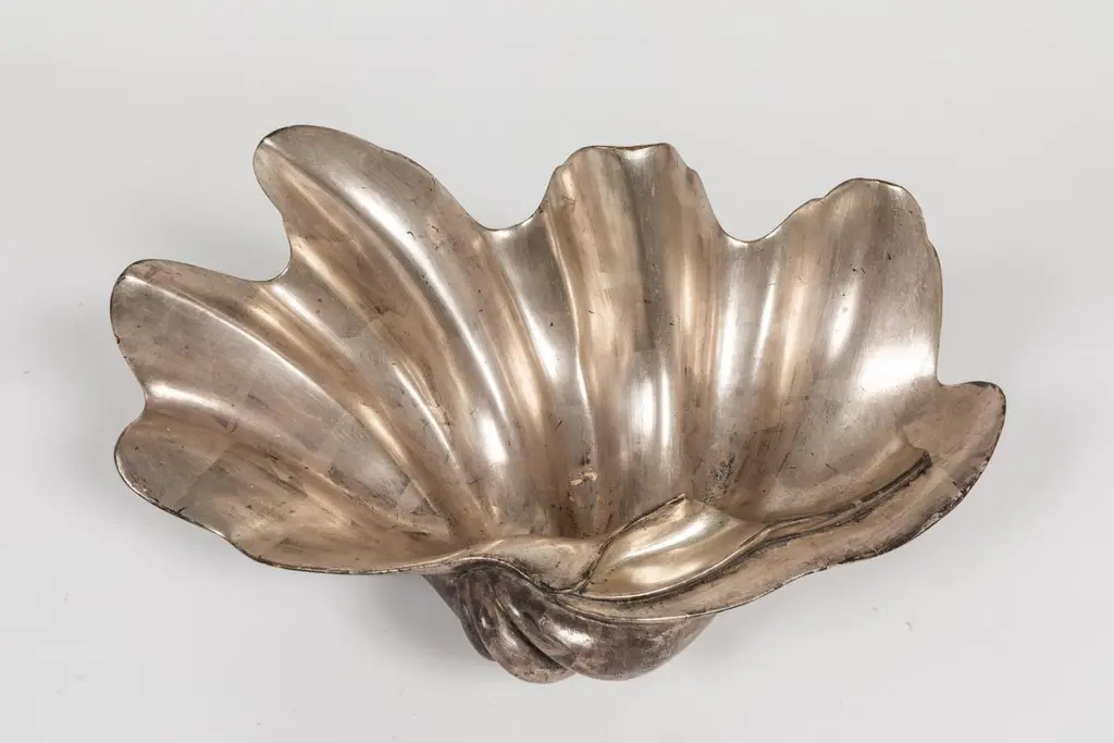 PLEASE NOTE ONLY THE SMALLER OF THE TWO SHELLS IS AVAILABLE. This pair of carved wood Clamshells are gessoed finished in White Gold and then burnished to a warm glow. The price listed is for the pair. Can be purchased separately The larger clamshell measures 26.5"W X 16"D X 10.75"H and is priced at $1800. The smaller clamshell measures 16"W X 13.5"D X 10.25"H and is priced at $1400. These present spectacular on a dining table or center table.