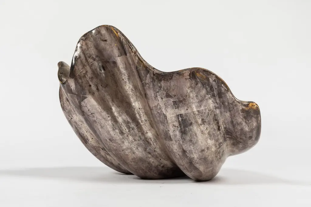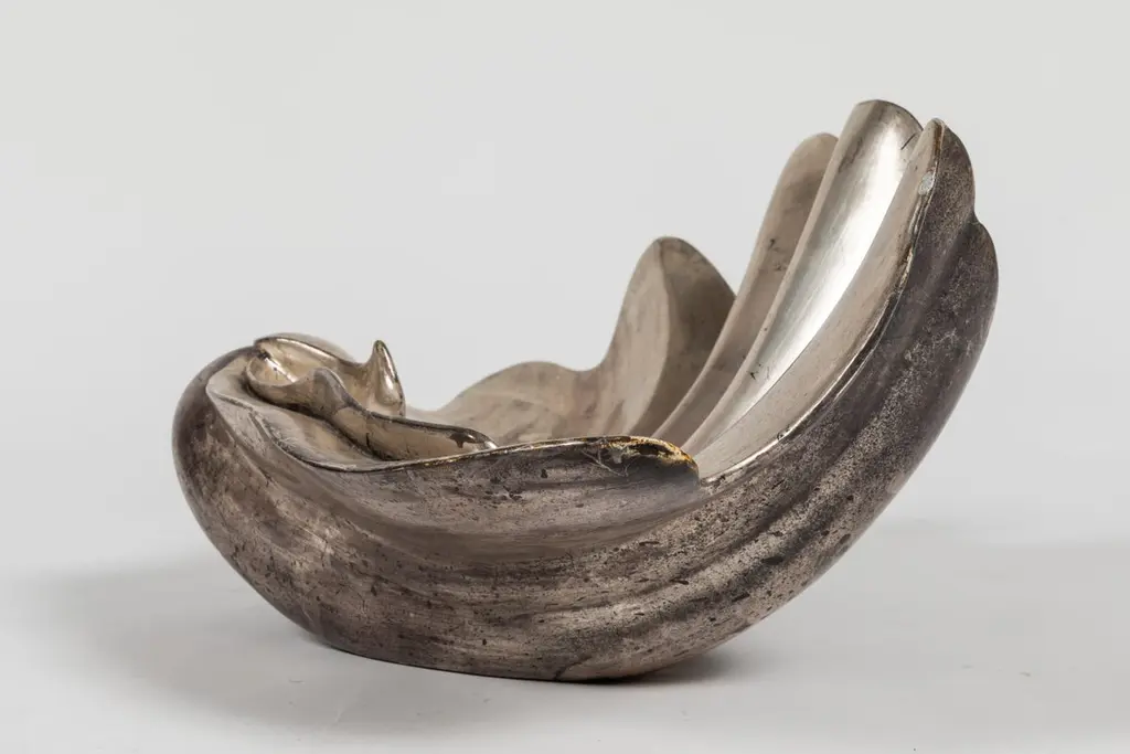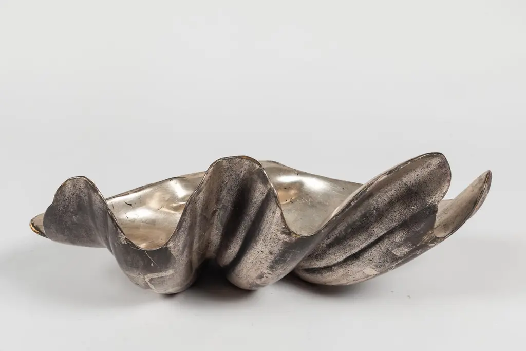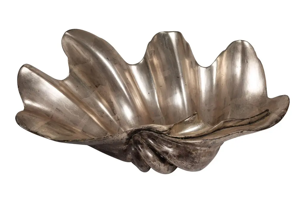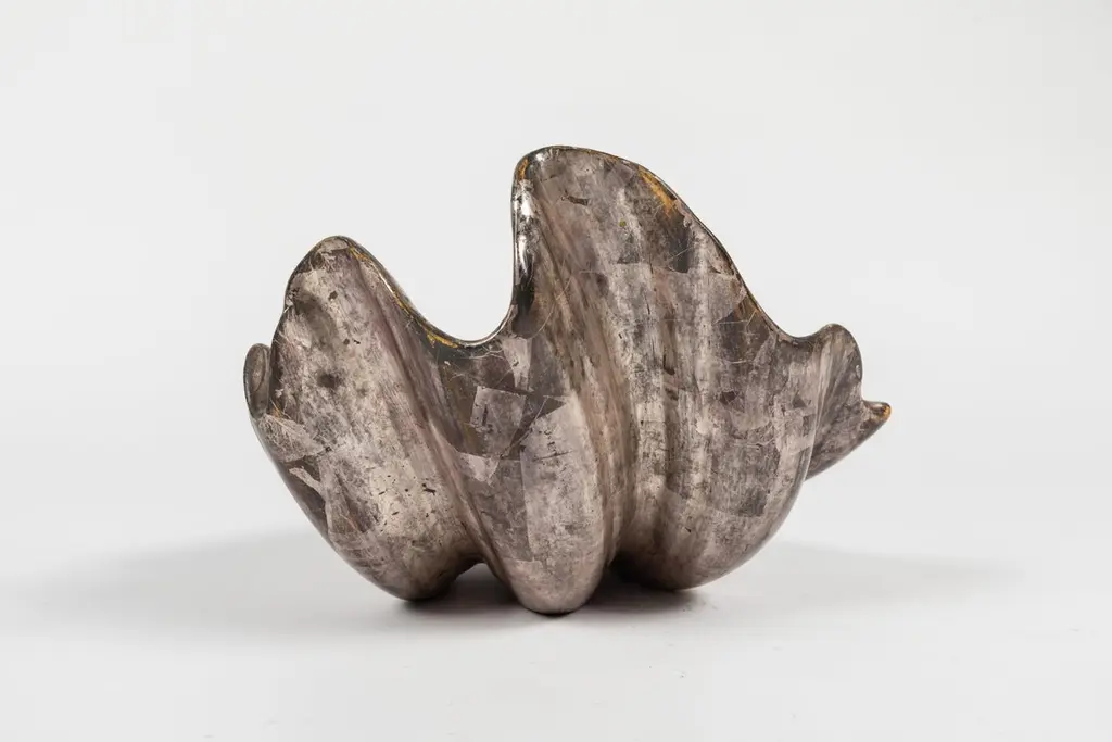 PLEASE NOTE ONLY THE SMALLER OF THE TWO SHELLS IS AVAILABLE. This pair of carved wood Clamshells are gessoed finished in White Gold and then burnished to a warm glow. The price listed is for the pair. Can be purchased separately The larger clamshell measures 26.5"W X 16"D X 10.75"H and is priced at $1800. The smaller clamshell measures 16"W X 13.5"D X 10.25"H and is priced at $1400. These present spectacular on a dining table or center table.