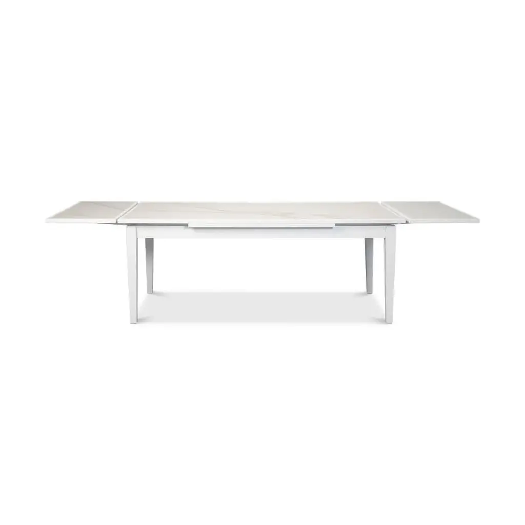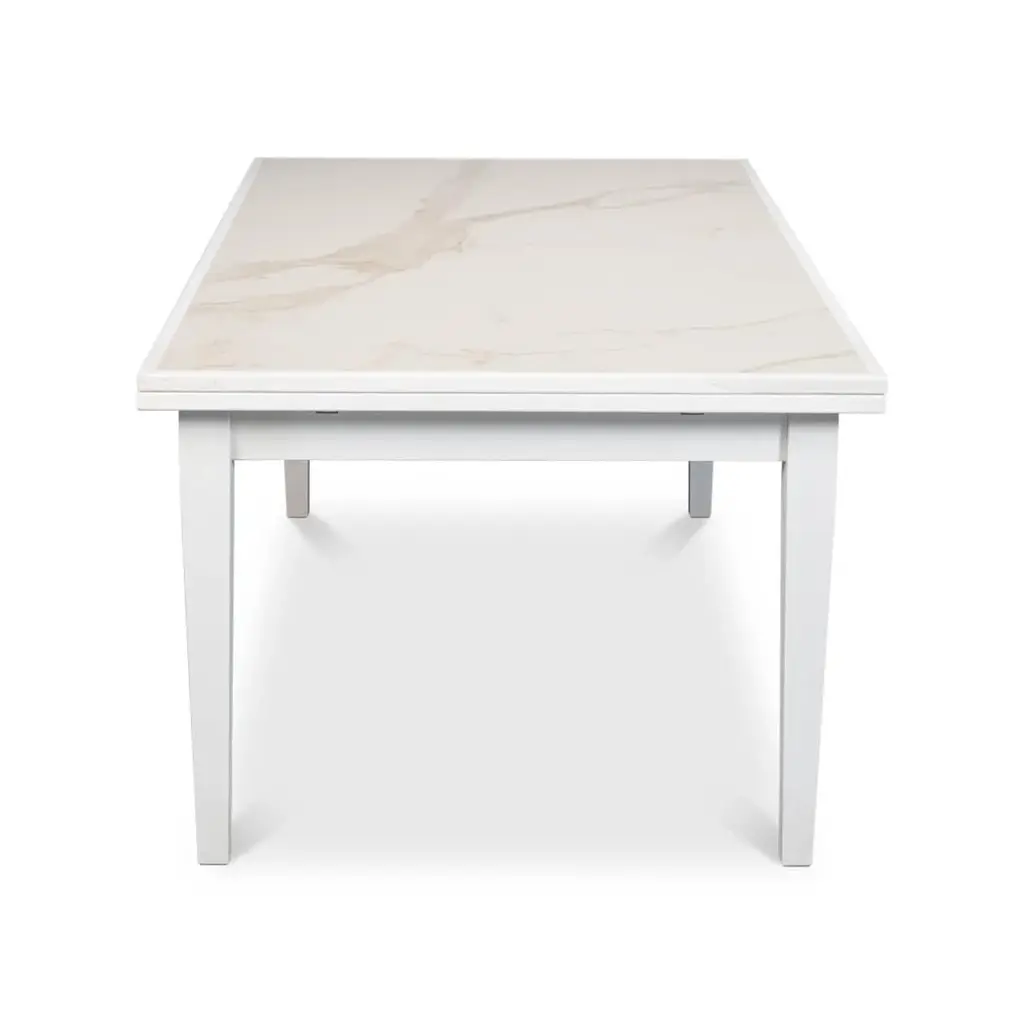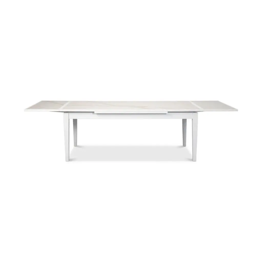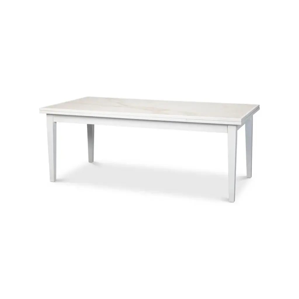 The Italian-style draw-leaf table extends from an 81" game table to a larger 120" long dining table. This unique table features a marbleized porcelain inset to each top section and comfortably seats 6 to 8 people. With a beautiful white finish to complement the marbleized top. Open dimensions: 120" W x 41" D x 30.5" H Closed dimensions: 81" W x 41" D x 30.5" H
