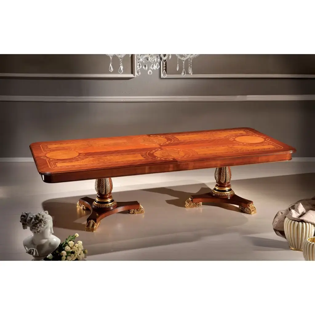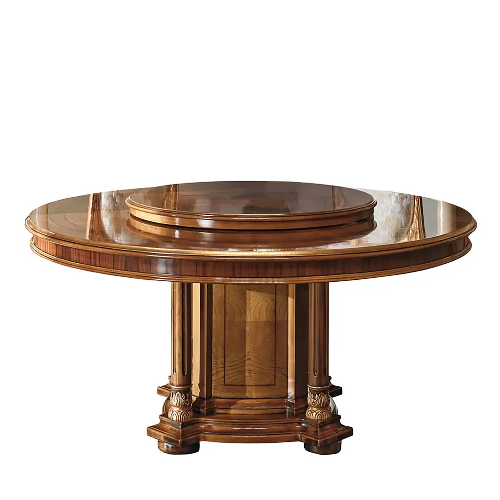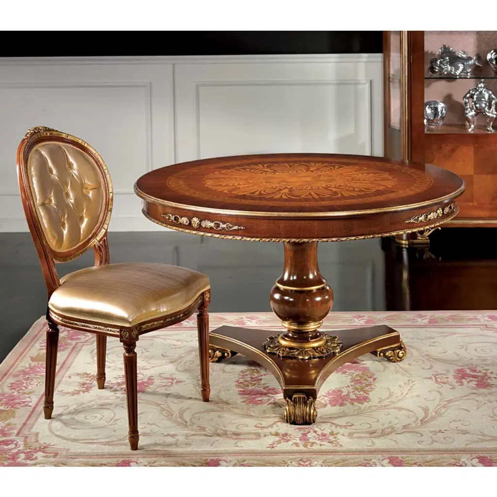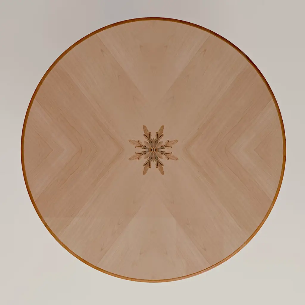 A sublime statement in a classic dining room, this exquisite round dining table boasts an opulent design handcrafted of refined materials. Distinguished by a central structure composed of four legs resting on a round base, it is fashioned of veneered white maple and cherry wood. Its plush charm is given by stunning handmade inlays in mother of pearl, pewter, maple, and refined decorations in gold leaf.
