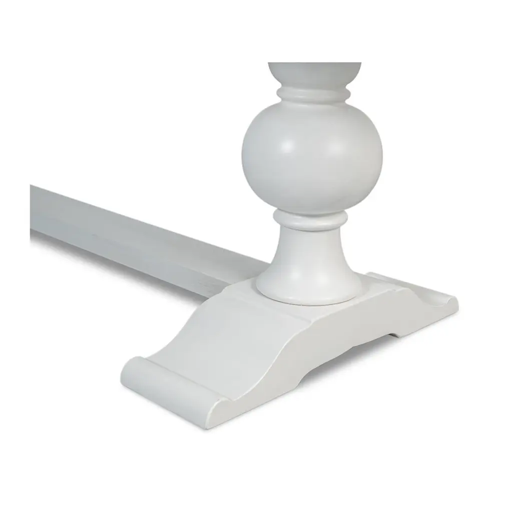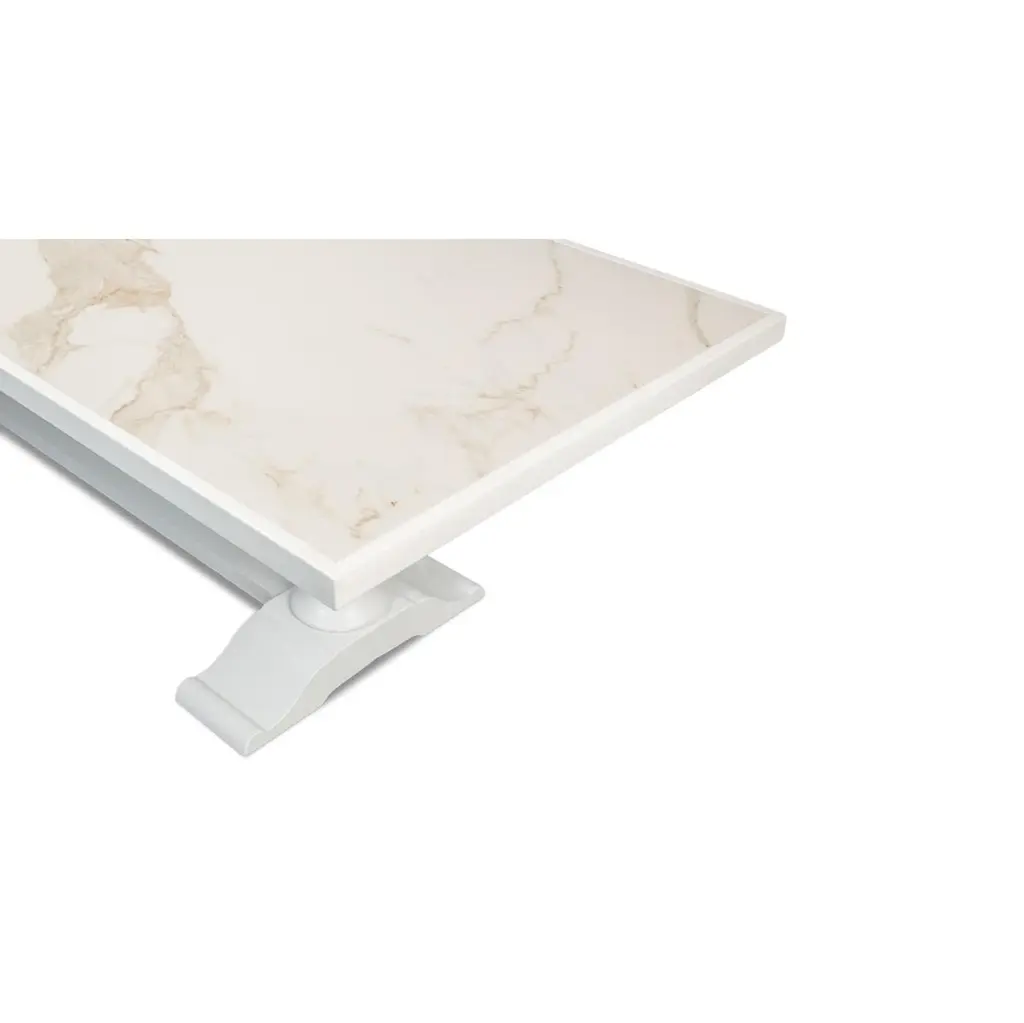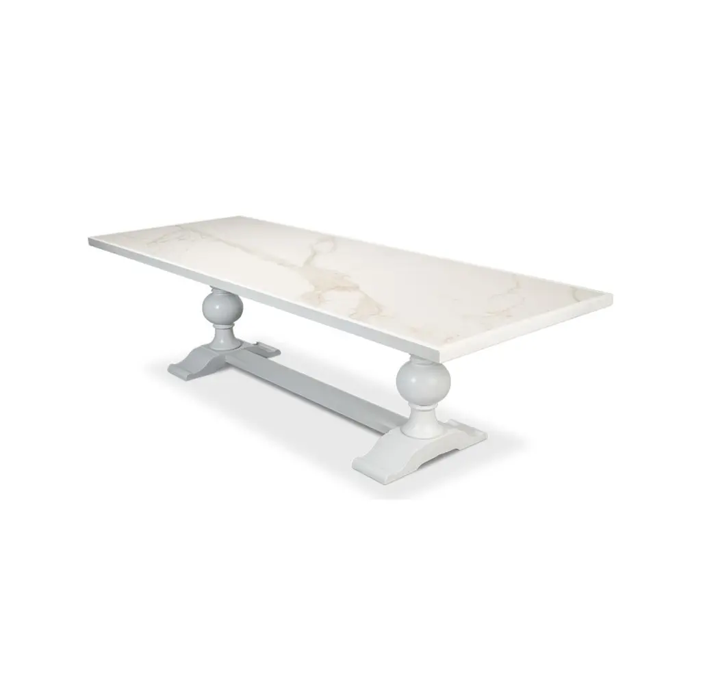 Dining table with a Calacatta porcelain inlaid top, on a turned baluster form double pedestal base with a white hand painted finish.Dimensions: 108" W x 40" D x 30" H