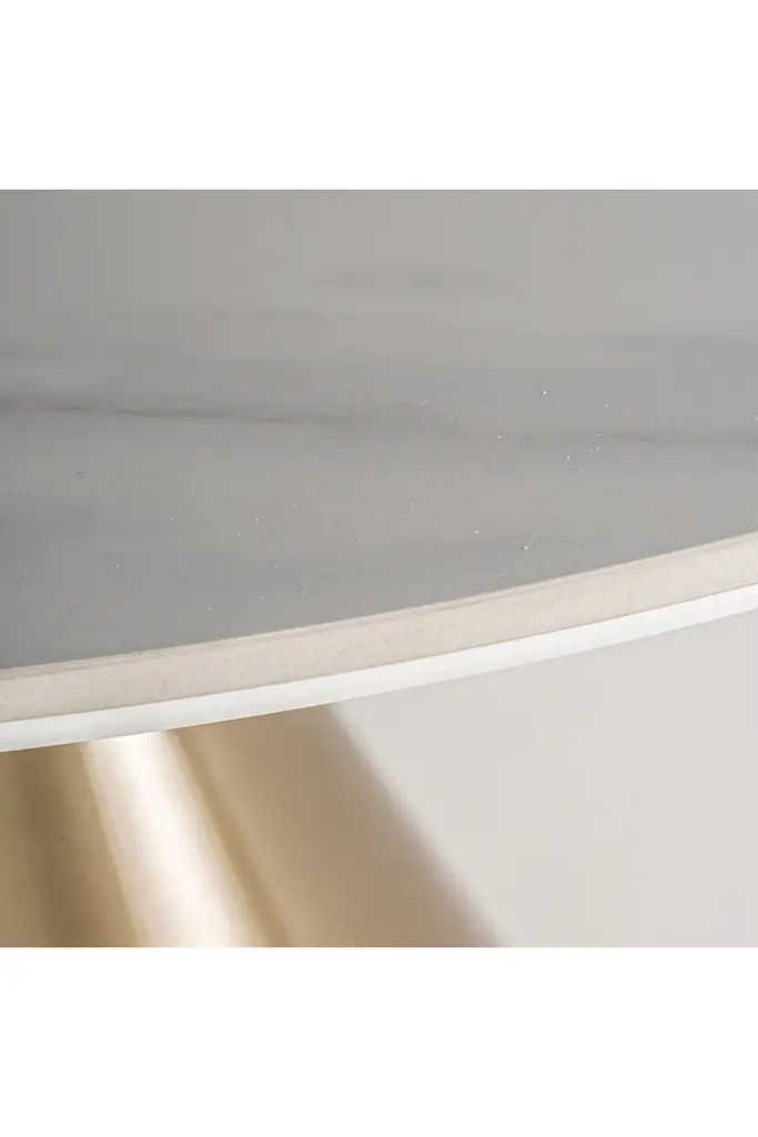 The Freyung Dining Table by Vical Home stands out for its contemporary and sophisticated design. This unique piece features an elegant gold monopod and a white aesthetic that stands out in any space. Offering an atmosphere of pure style and modernity with the round gold monopod dining table.