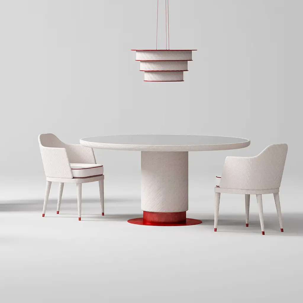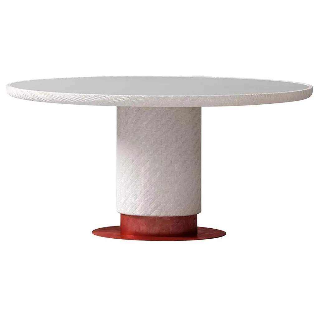 The monolithic and sculptural line of this stunning table is easily adaptable to outdoor spaces thanks to its elegant and resistant materials. Raised on a flat platform of galvanized iron polished and coated with red epoxy powder, the pedestal base is crafted of aluminum covered with white handwoven resin that gives a unique and refined texture. A round white gres ceramic top completes this versatile piece that provides the perfect spot to serve poolside brunches and dinner parties on a veranda or patio.