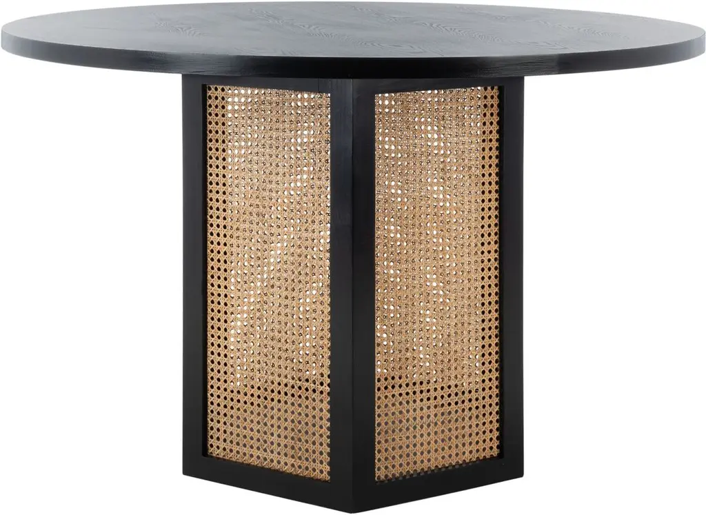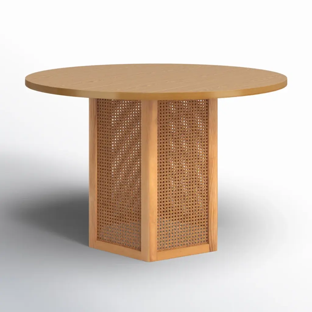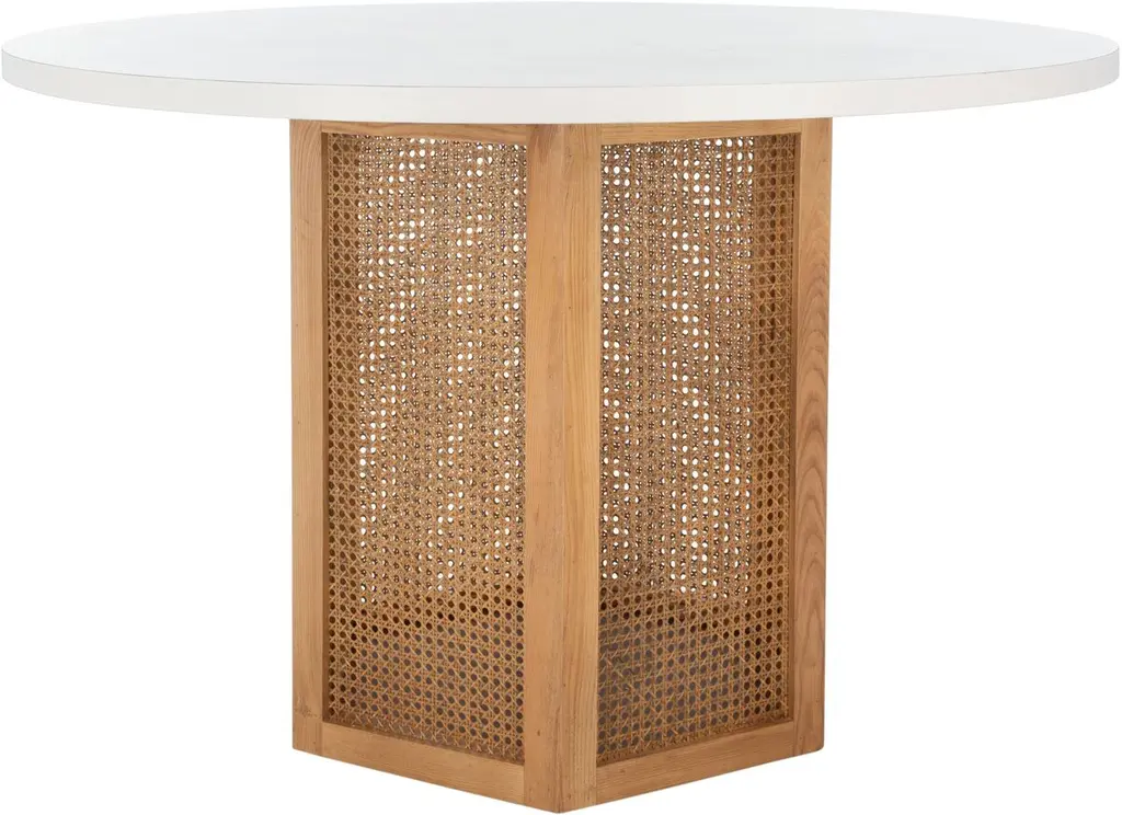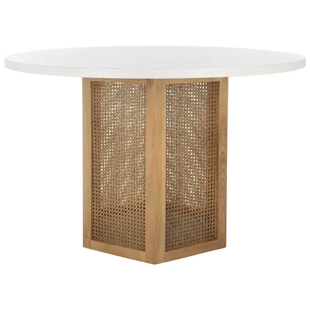 7 Contemporary center /dining tables supported on a 6 sided cerused oak pedestal base with cane panels supporting a round white marble veneer top (priced each).
