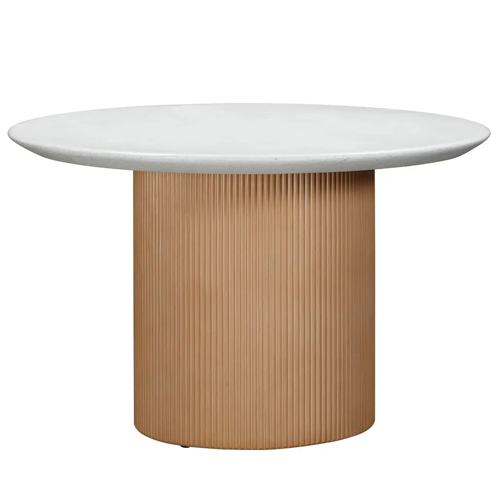 Transform your dining space with the Indoor/Outdoor Round Concrete Dining Table. Boasting a robust concrete base and adorned with beautiful modern finishes, this table seamlessly marries strength and style. Whether indoors or out, its simple silhouette and captivating neutral tones make it a perfect choice for worry-free dining, adding a trendy touch to any setting.