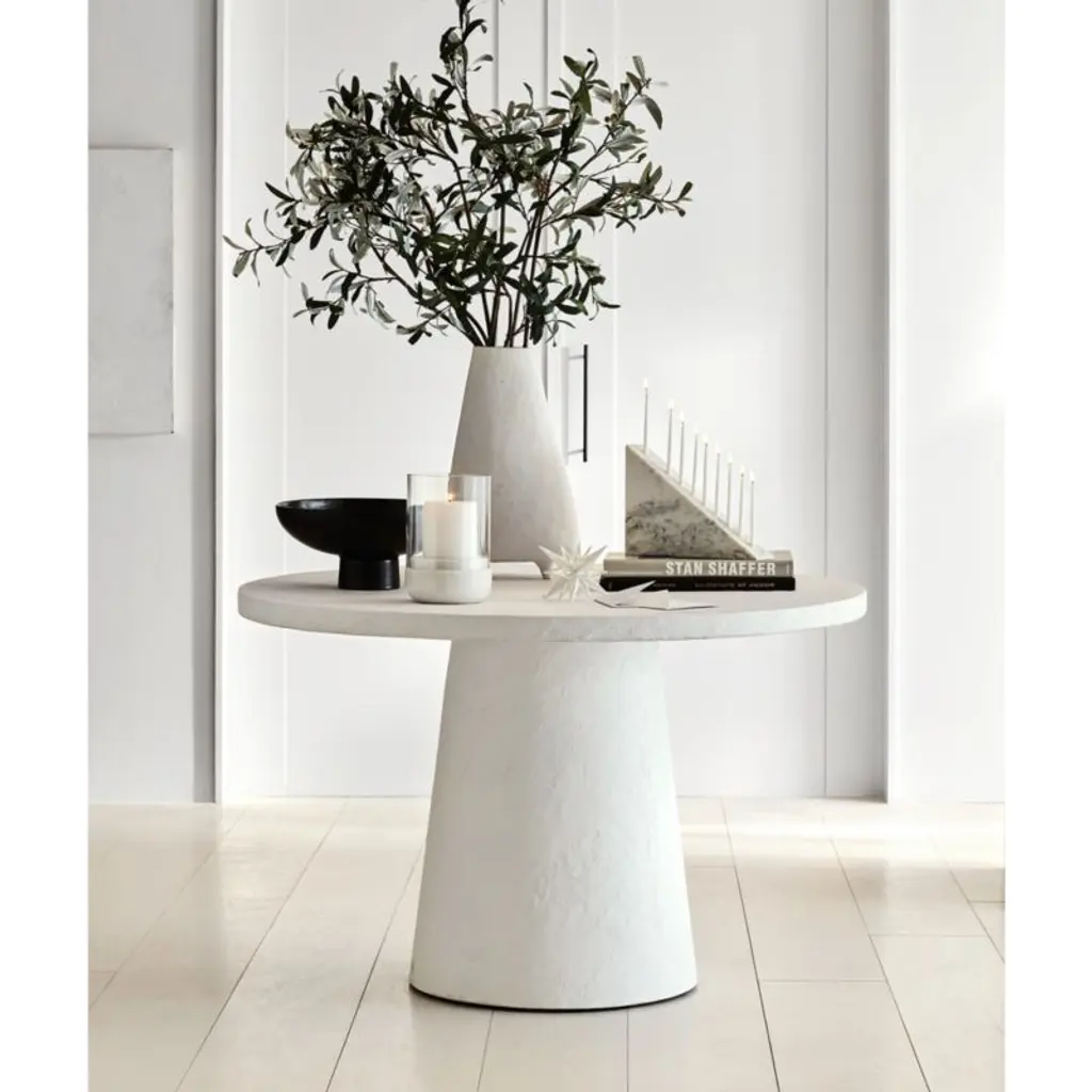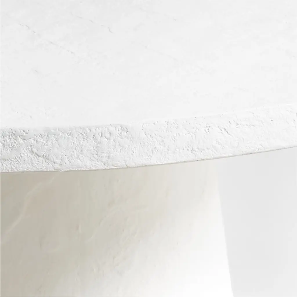 Willy distills the classic pedestal table down to its striking essentials in pure white. The white table's bold conical pedestal and simple round top are made with a plaster-like substance that looks like concrete but is lighter in weight and more easily fabricated into this dramatically simple shape. The Willy pedestal dining table is a Crate & Barrel exclusive.Part of the Leanne Ford furniture collection, exclusive to Crate and Barrel. A rising design star with a motto we can get behind"paint white, wear black"Ford created pieces that capture her cool, artful vibe.