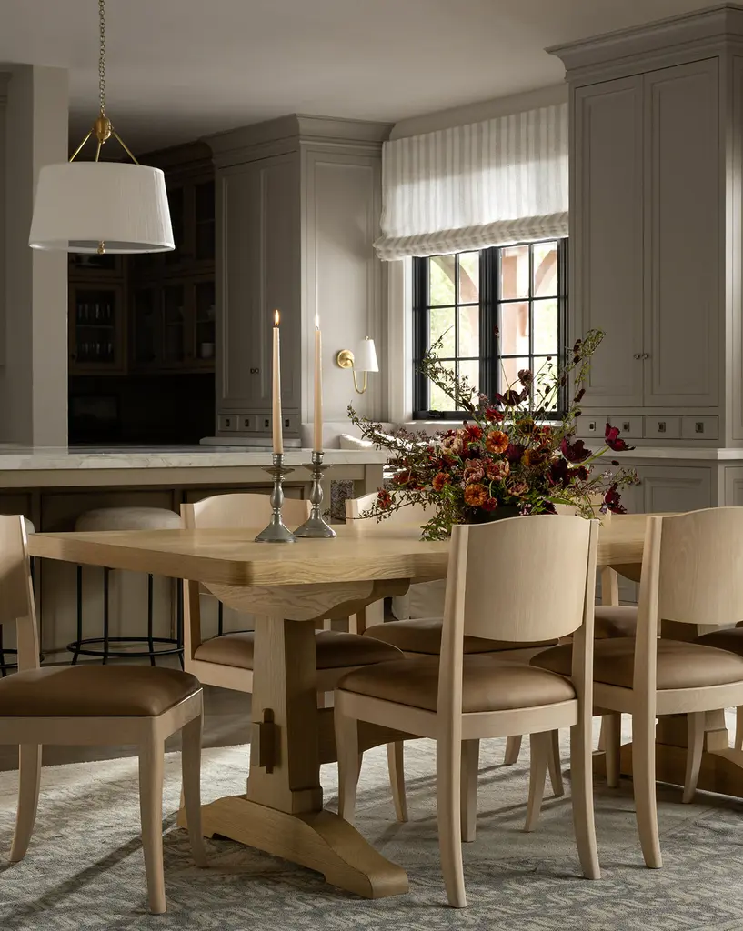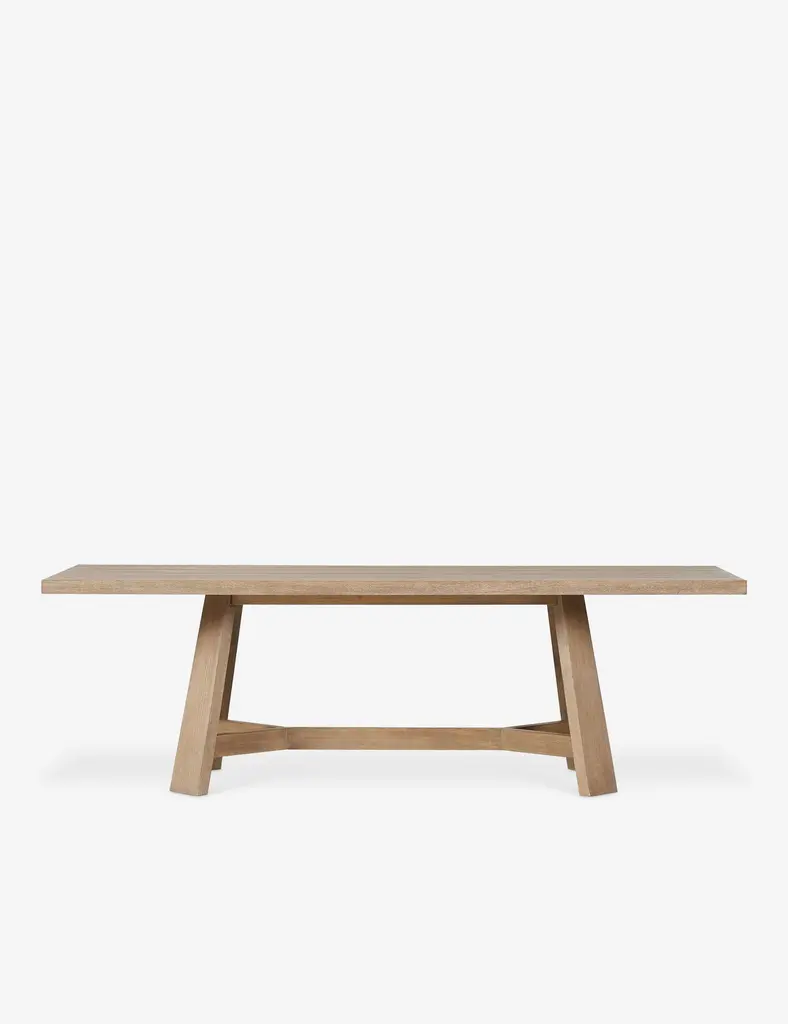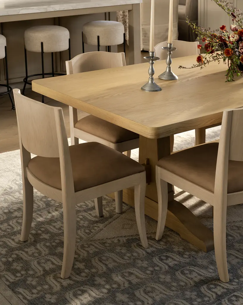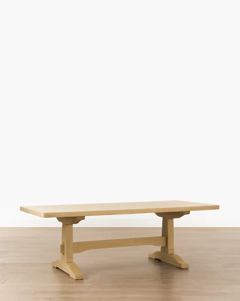 Crafted from oak with a heritage white oak finish, the Wilton Dining Table brings both form and function to your dining space. With its architectural inspiration and timber framing details, its high-quality construction stands the test of time.